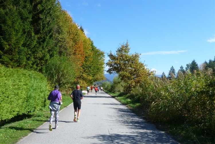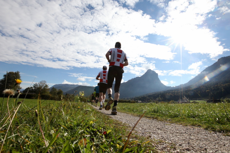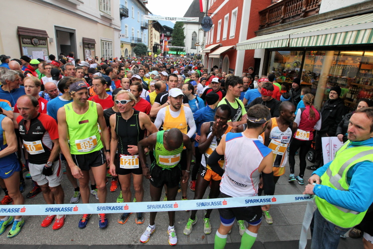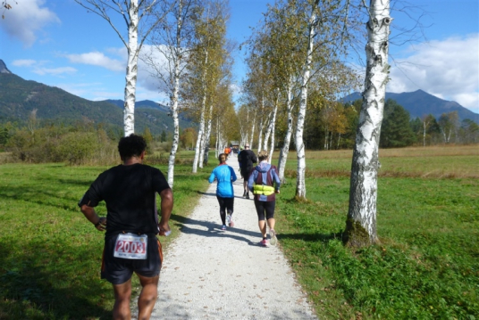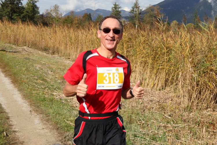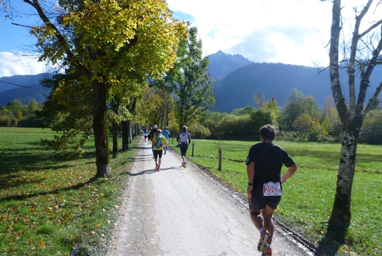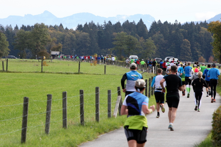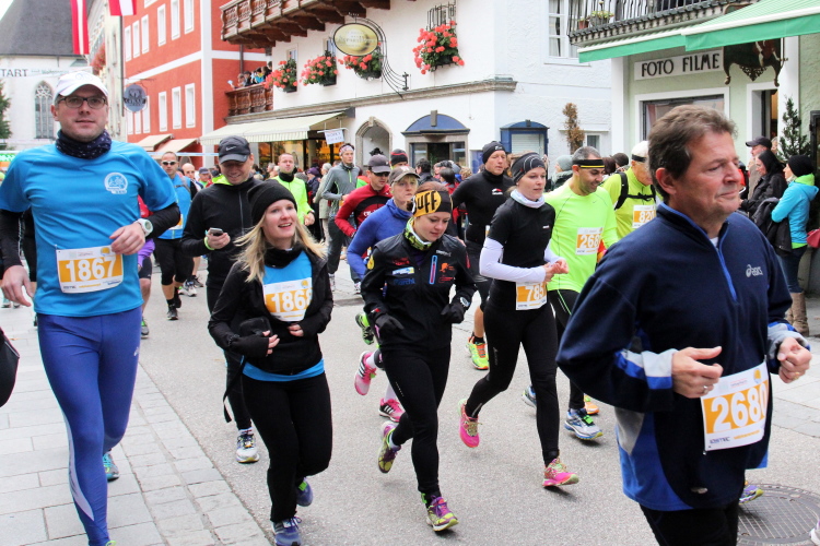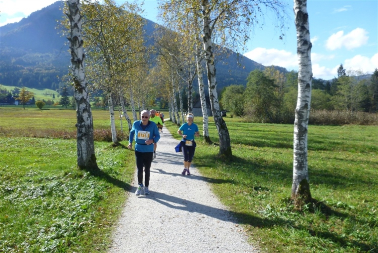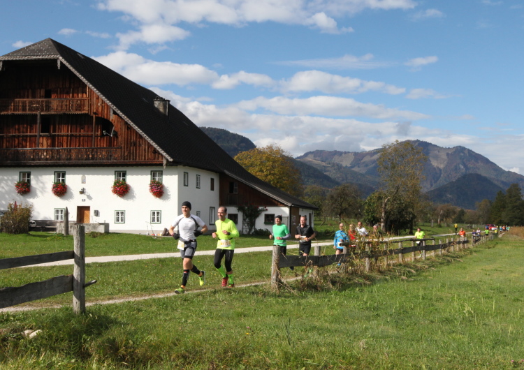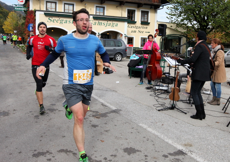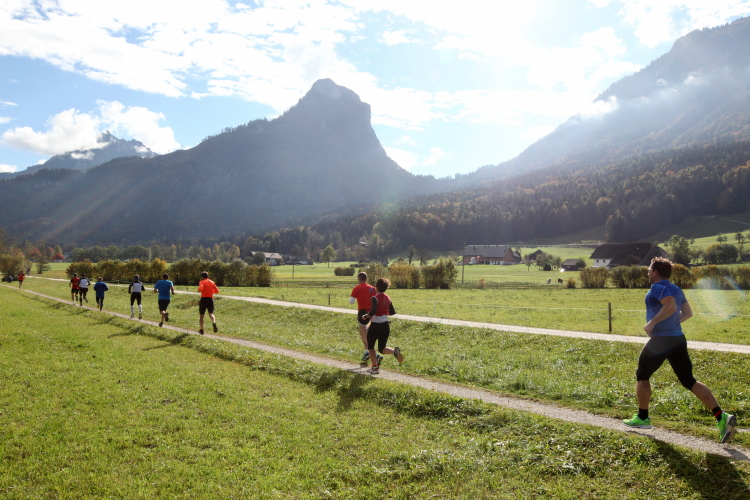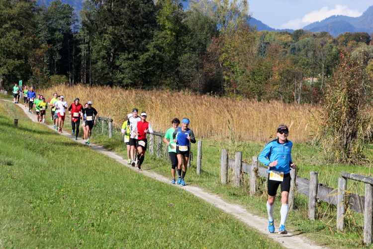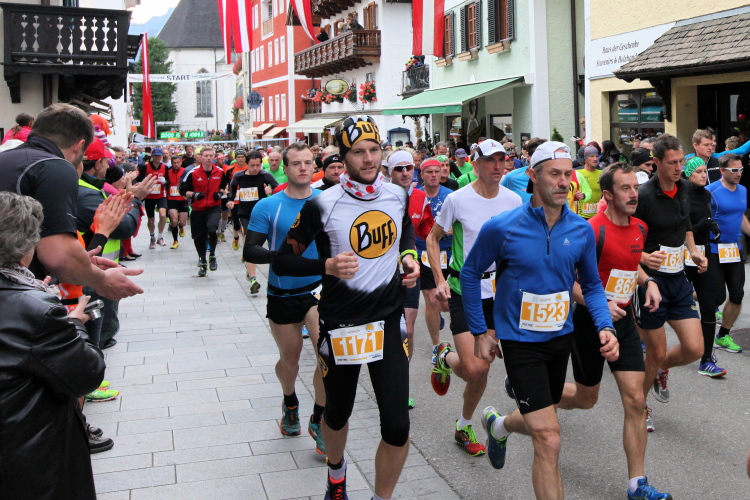 Ein wunderbarer Spazierweg ist der nächste Untergrund, fast trailartig geht es wieder zum See. Der Bürgelstein, ein riesiger, in den See ragender Felsen, ist bereits auszumachen. Ich weiß, dass die Panoramaläufer diesen im Gegensatz zu uns seeseitig über eine lange Bohlenbrücke passieren dürfen. Da entgeht uns echt etwas! Das jammere ich später dem Zimmermann Franz, dem „Erfinder“ und stolze 40 Jahre langen Gesamtleiter des Laufs (Vorgänger vom Sperrer Franz) vor und bilde mir ein, einen klugen Vorschlag gemacht zu haben. Weit gefehlt, denn der Franz fragt zu recht, wo er denn die Mehrkilometer einsparen solle? Nee, dann doch lieber wie gehabt an der tollen Trinkhalle in Bad Ischl starten. Gut, wenn man sich mit Erwachsenen unterhält!