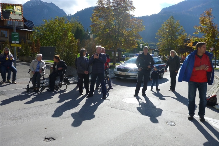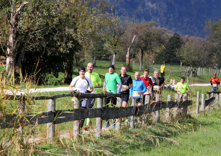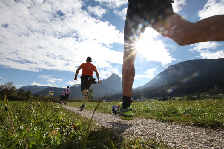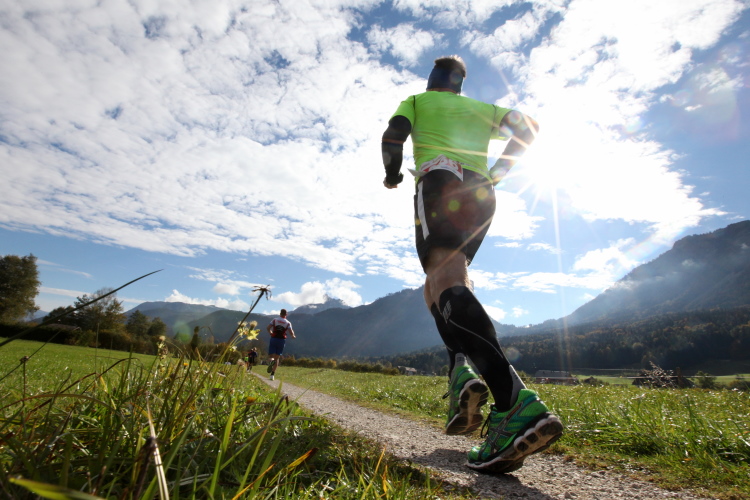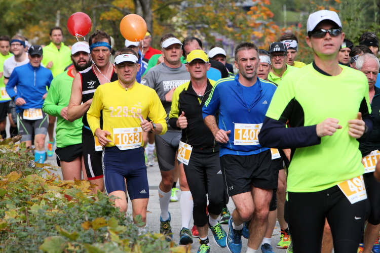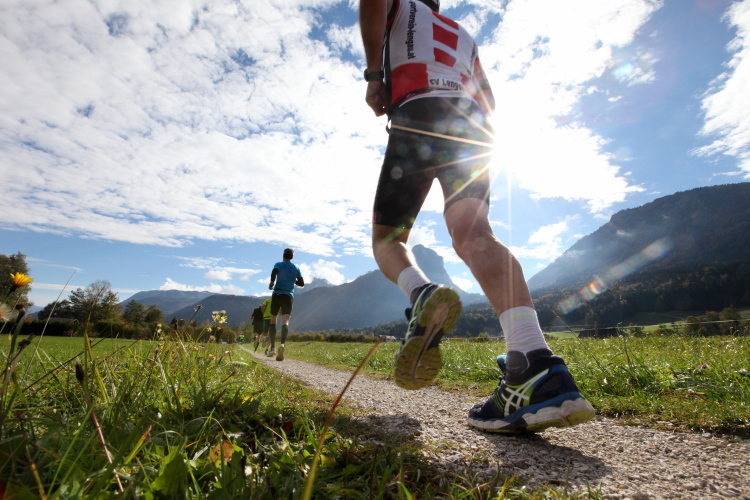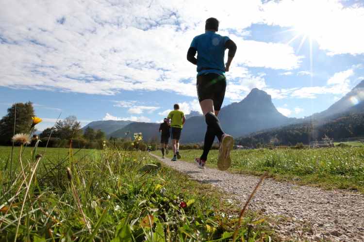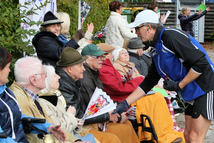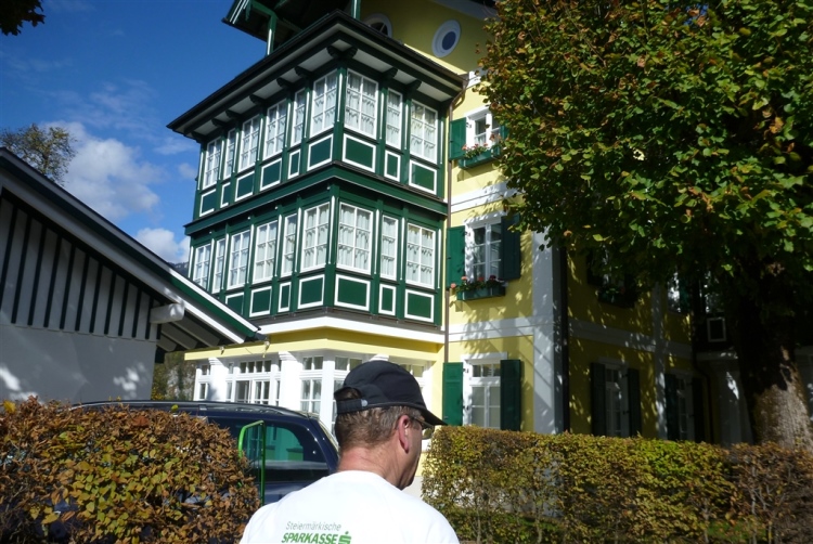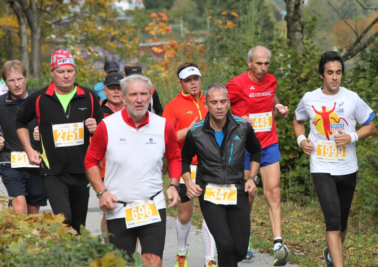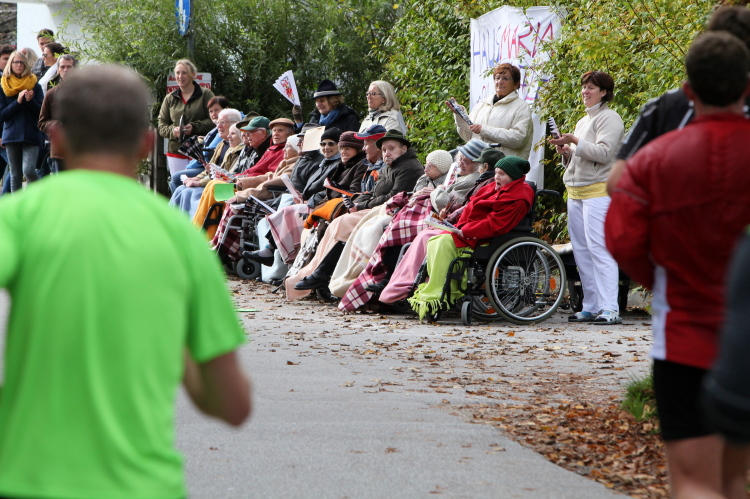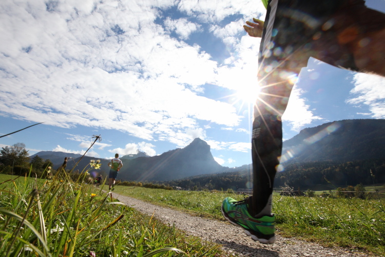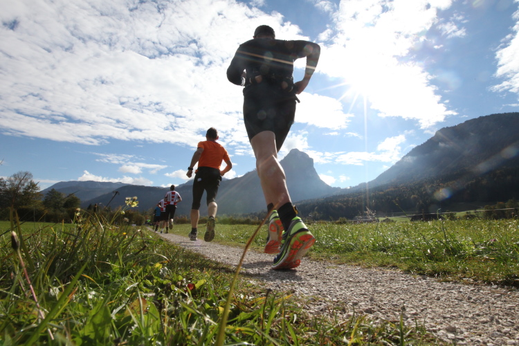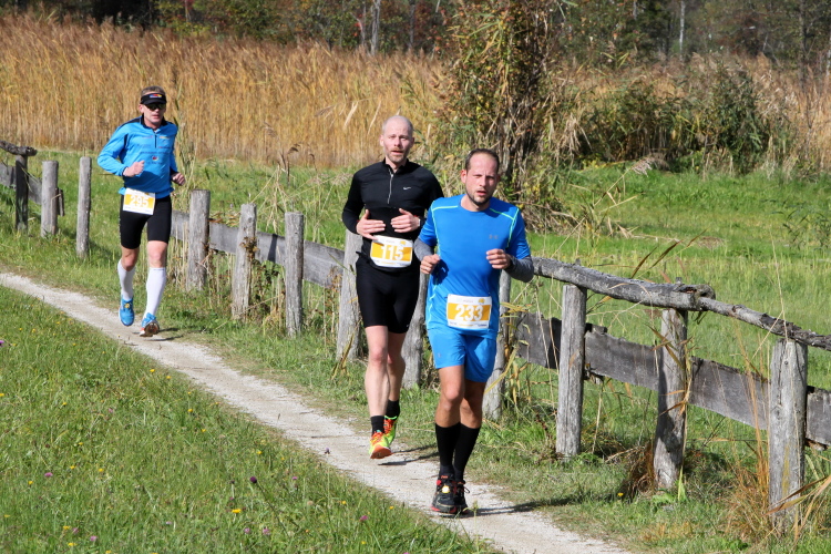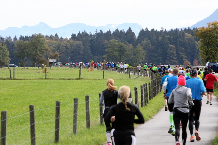 Ein wunderbarer Spazierweg ist der nächste Untergrund, fast trailartig geht es wieder zum See. Der Bürgelstein, ein riesiger, in den See ragender Felsen, ist bereits auszumachen. Ich weiß, dass die Panoramaläufer diesen im Gegensatz zu uns seeseitig über eine lange Bohlenbrücke passieren dürfen. Da entgeht uns echt etwas! Das jammere ich später dem Zimmermann Franz, dem „Erfinder“ und stolze 40 Jahre langen Gesamtleiter des Laufs (Vorgänger vom Sperrer Franz) vor und bilde mir ein, einen klugen Vorschlag gemacht zu haben. Weit gefehlt, denn der Franz fragt zu recht, wo er denn die Mehrkilometer einsparen solle? Nee, dann doch lieber wie gehabt an der tollen Trinkhalle in Bad Ischl starten. Gut, wenn man sich mit Erwachsenen unterhält!