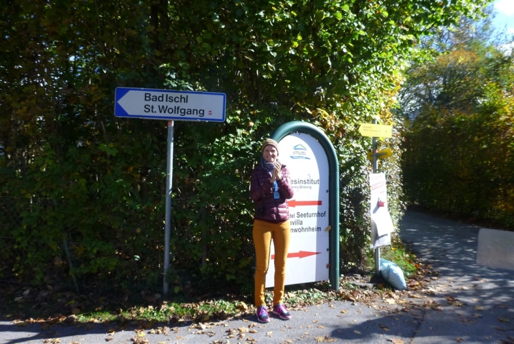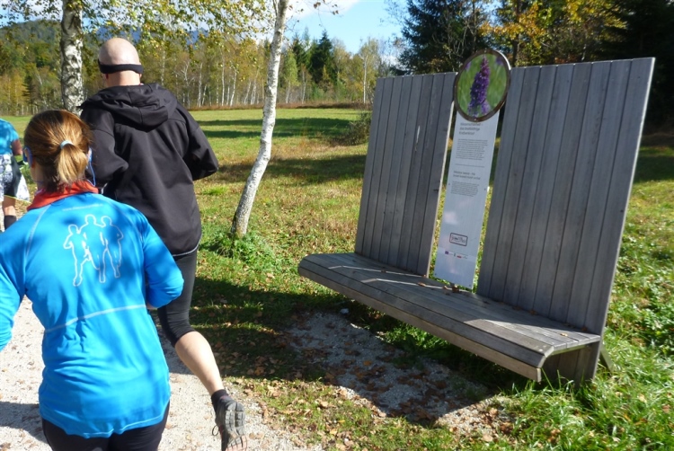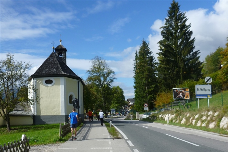 Durch eine sehr attraktive Birkenallee nähern wir uns Strobl, dem Startort des 5,2 km-Panoramalaufs. Auch hier stehen etliche wunderschöne Ruhebänke, die mit wertvollen Informationen versehen sind, geschmackvolle Orte, an denen man gerne ist. „Gschma Platzl“ nennen sie hier solche netten Fleckchen. Dann ist auch der Startbogen der kürzesten Strecke unterquert und damit sind die letzten fünf km, in Strobl beginnend, angebrochen. Eine breite Teerstraße bringt uns über ein Gewässer wieder an die Landstraße in Richtung St. Wolfgang, wo zwar nur wenige, zu diesem Zeitpunkt aber unangenehme Höhenmeter auf uns warten. Aber auch die haben schnell ein Ende und für uns hat sich der Kreis geschlossen, denn die letzten vier km kennen wir bereits als km 11 bis 15. Daher lasse ich die Fotos für sich sprechen.
