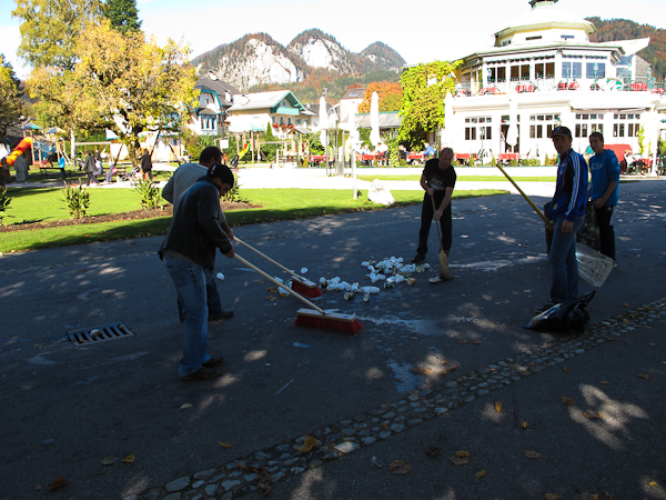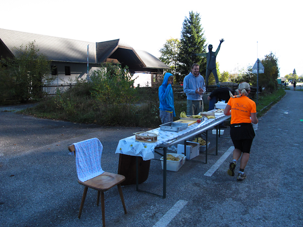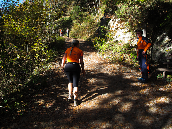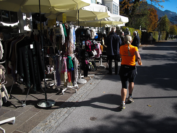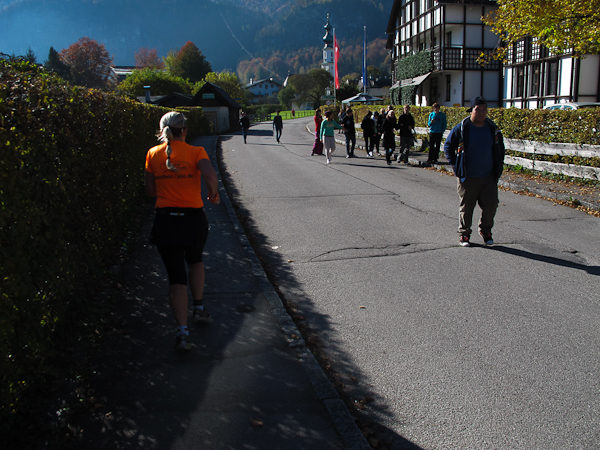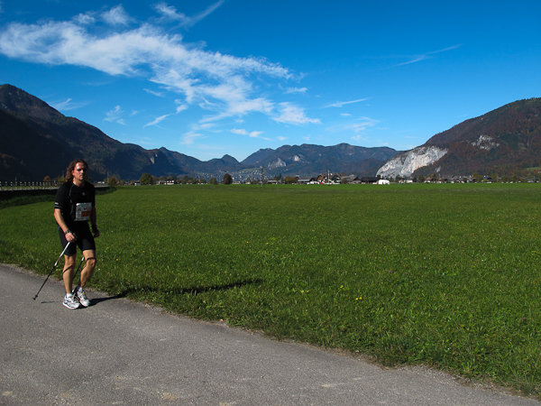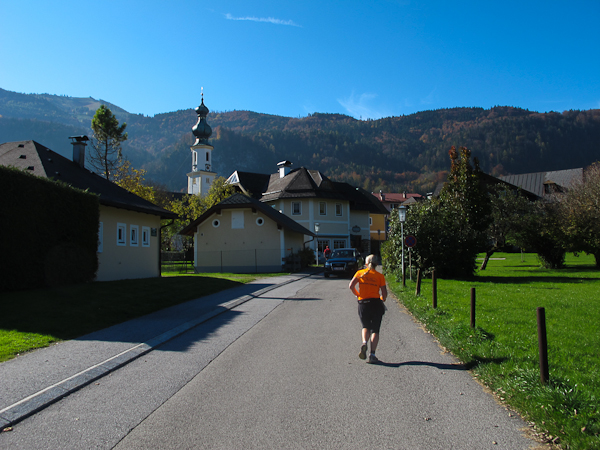 Wir Marathonläufer werden sozusagen um zwei Häuserecken geleitet. Dabei laufen wir einmal über die Zeitmatte und gelangen dann wieder auf die klassische 27 Kilometerrunde des Wolfgangseelaufes. Hier wäre auch für uns ein Verpflegungspunkt gewesen, diesen haben wir aber verpasst. Wir sind zu beschäftigt, uns durch die vielen Finisher der anderen Läufe zu schlängeln. Auf einmal fehlt uns auch die Orientierung und wir sehen auch keine anderen Läufer mehr vor uns. Eine Passantin weist uns den richtigen Weg.
