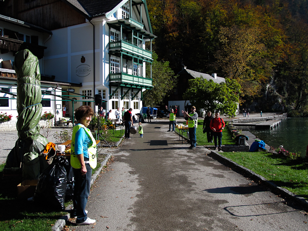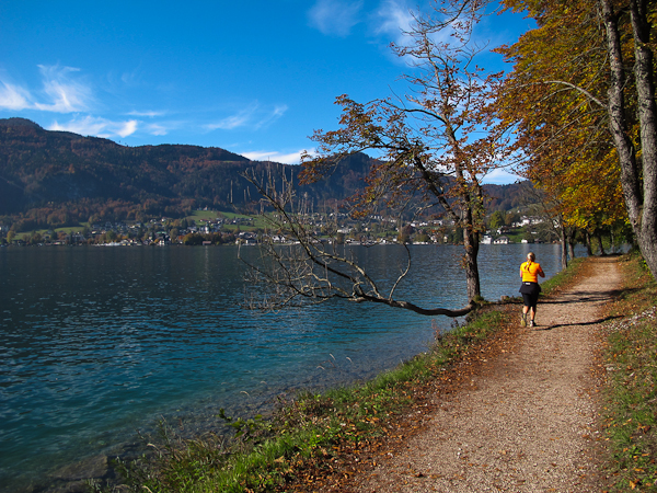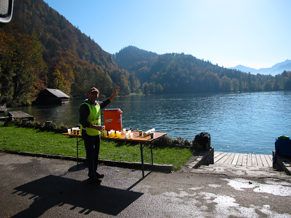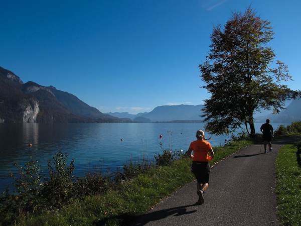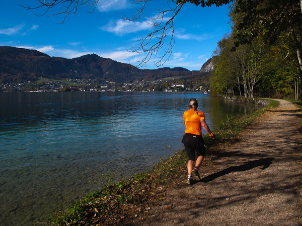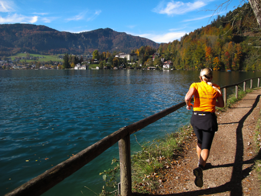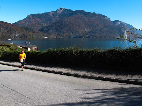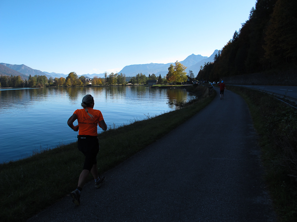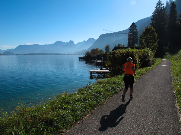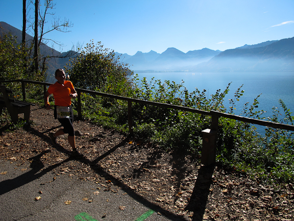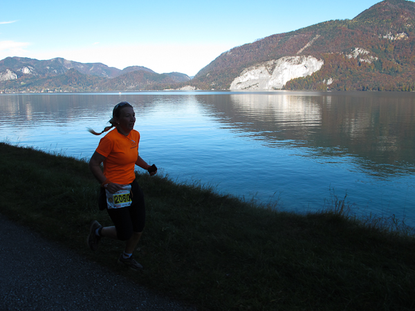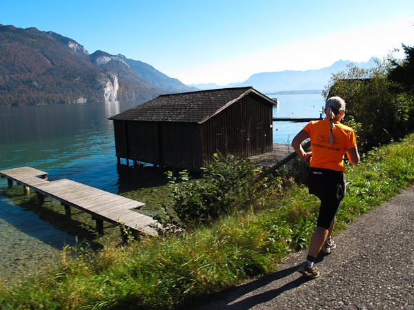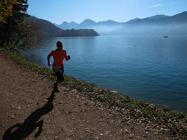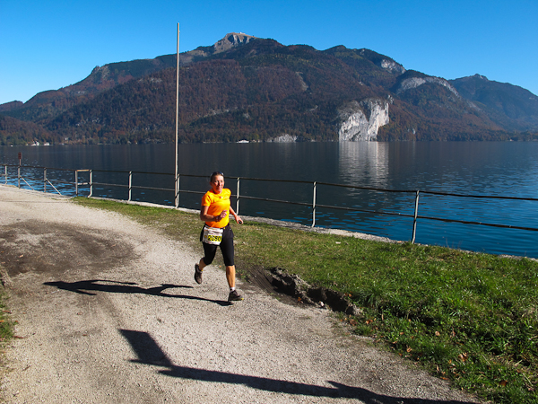Wir sind wieder unten am See. Von weitem schallt die Stimme des Moderators zu uns. Bei Kilometer 22 ist hier am 300 Jahre alten Gasthof Fürberg eine Verpflegung aufgebaut. Der Moderator nennt jeden Läufer namentlich und die vielen Helfer verbreiten einfach nur gute Laune. Weiter führt die Strecke an einem schmalen Uferweg direkt am Wolfgangsee mit seinem blauen Wasser. Der See ist so klar, dass sich die Fischarten vom Land aus bestimmen lassen könnten. Segel-Farbtupfen von Orange und Weiß - wie für uns arrangiert.