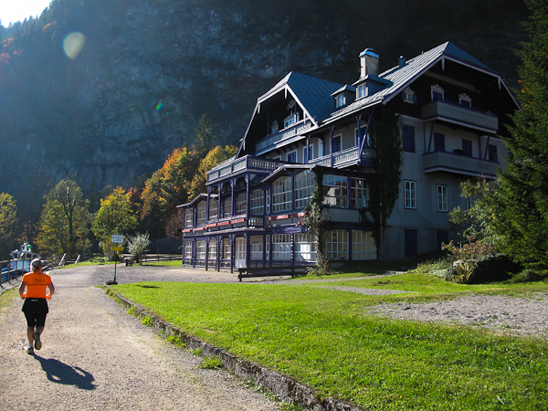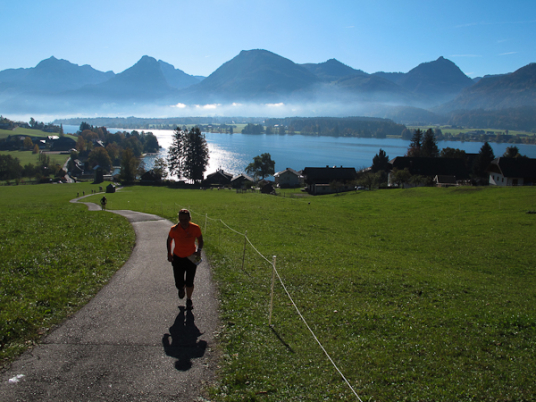 Die Morgensonne glitzert grell auf dem See und hat dem Nebel eingeheizt. Weiter geht’s am Fuße der Bergstation der Schafbergbahn vorbei. Sie ist die steilste Dampfzahnradbahn Österreichs. Bevor 350 italienische Arbeiter 1892/93 die Bahnschienen auf den Schafberg legten, kraxelte das Volk stundenlang bergauf. Feinere Herrschaften ließen sich auch schon mal tragen. Heute fährt man bequem mit der Dampfeisenbahn in einer halben Stunde nach oben. Man kann aber auch am Wettkampf „Mensch gegen (Dampf)Maschine“ teilnehmen. Auf einer Streckenlänge von nur 5,8 km gilt es 1240 Höhenmeter, immer entlang der Bahntrasse zu überwinden.