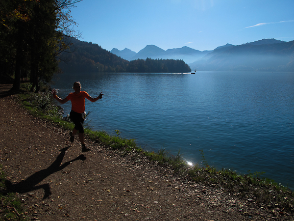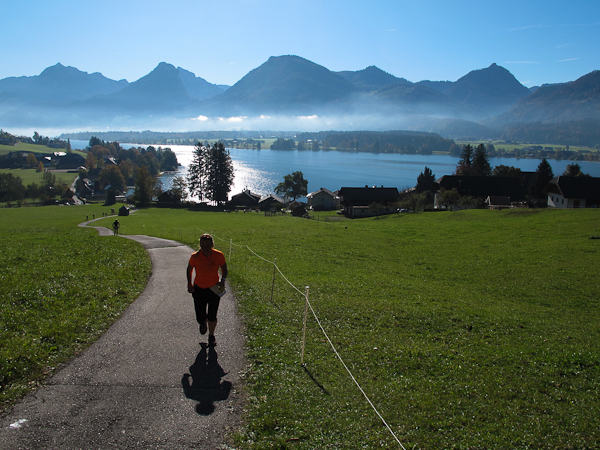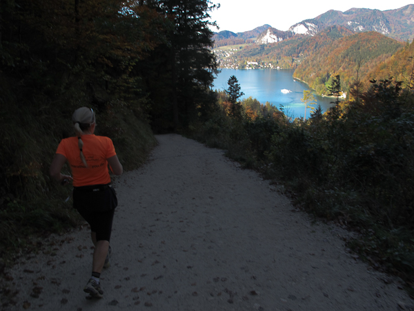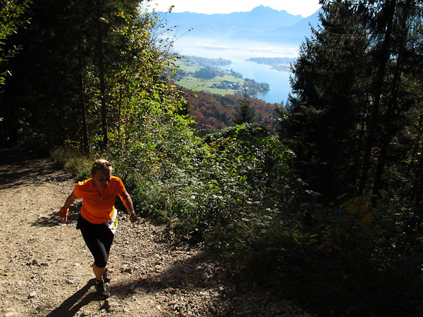 Im Wald riecht es nach nasser Erde und Pilzen. Wie zur Erlösung macht der Weg, der nun erst leicht bergab führt, den Blick frei zum Wolfgangsee. Es ist tatsächlich unbeschreiblich schön. Das sind die seltenen Momente, auf die ich mich während des ganzen Laufes freue.