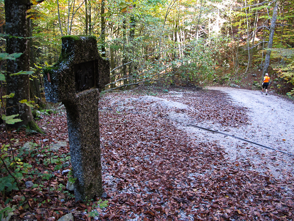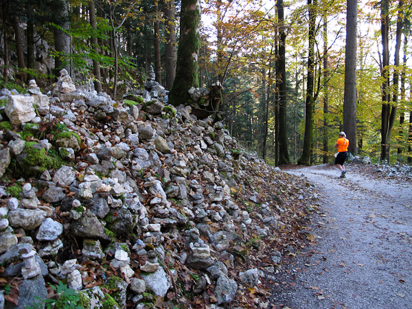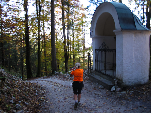 Man muss sich das mal vorstellen. Einige Pilger haben sich im Eifer ihrer St. Wolfgang-Verehrung den Weg zusätzlich erschwert. Eiserne Ringe hängten sie sich um den Körper oder um den Hals. Oder stellt euch nur mal vor, was hier los wäre, liefe einer nackt und mit ausgestreckten Armen auf den Falkenstein. Für den ein- oder anderen Läufer ist es aber auch heute nicht einfach. Schleppte man früher schwere Bußkreuze, so trägt man heute schwere Rucksäcke auf dem Rücken (Kay). Steckte man sich früher Linsen in die Schuhe oder ging Barfuß, so sind es heute drückende Einlagen (Andrea).
