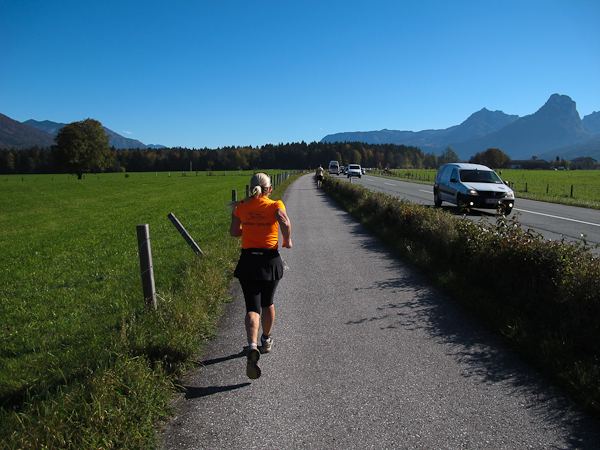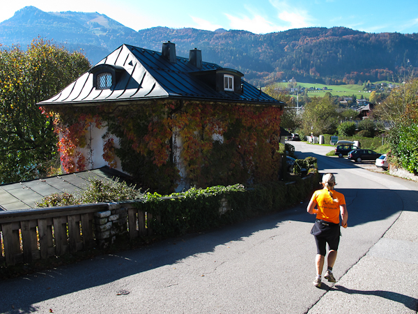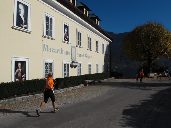 Dieser Ort hat viel erlebt, die Einheimischen nehmen es gelassen. Im schönen Ortskern von St. Wolfgang geht es ganz schön schnell und elegant abwärts. Das zeigt Wirkung bei den Zuschauern, die rechts und links von der Strecke stehen und applaudieren. Ein großes Transparent über den Köpfen der Läufer sagt uns, dass wir nach einigen Metern scharf rechts abbiegen müssen. Vorbei am Rössl. Nicht das Weiße, sondern das Schwarze Rössl. Jetzt ist der langersehnte Moment endlich gekommen. Jedoch nicht für uns. Die fünf Kilometerläufer sind im Ziel. Vor uns liegen noch 27 Kilometer.