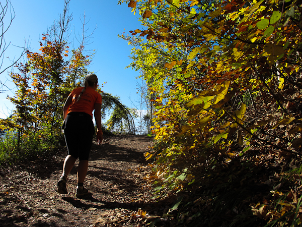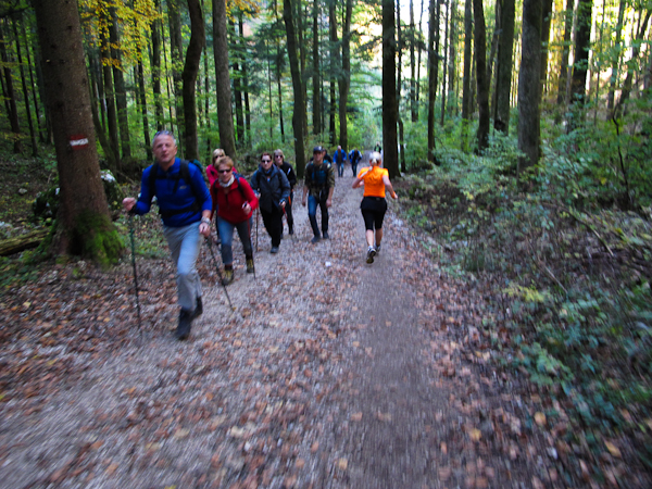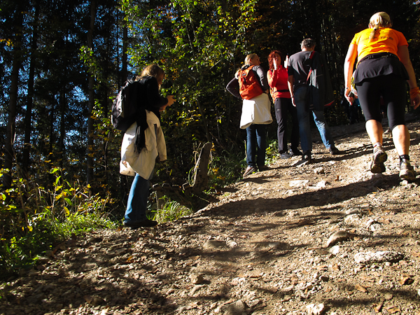 Der sehr steile Abstieg des mit feinem Schotter gespickten Hanges macht Spaß, fordert aber auch volle Konzentration und gute Oberschenkelmuskulatur. Immer wieder begegnen uns Wanderer beim Aufstieg. Das Interesse an diesem Weg ist mittlerweile so groß, dass einmal im Jahr "Mystische Wandertage" angeboten werden. Wer es mehr mit irdischer Power hält, den wird eher das hervorragende Konditionstraining mit Panoramablick beeindrucken.