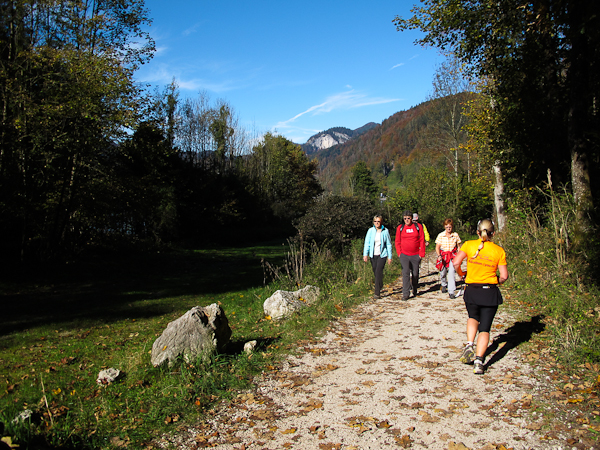 Für uns geht es da weitaus gemütlicher zu, denn wir laufen wunderschön flach am Seeufer entlang. Slalomartig laufen wir an den vielen Touristen auf der „Benatzky-Promenade“ vorbei, die hier am Schiffsanleger auf eines der Wolfgangseeschiffe warten. Ralph Benatzkys „Im Weißen Rössl“ ist für uns auch sozusagen die Antritts-Inszenierung kurz vor dem Aufstieg zum Falkenstein.