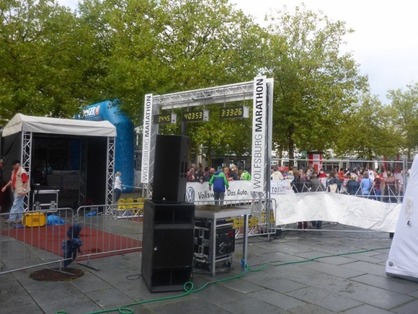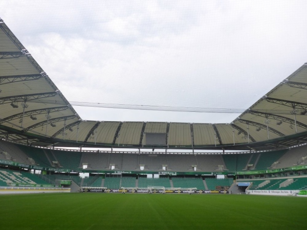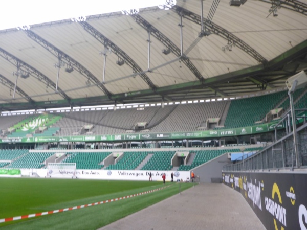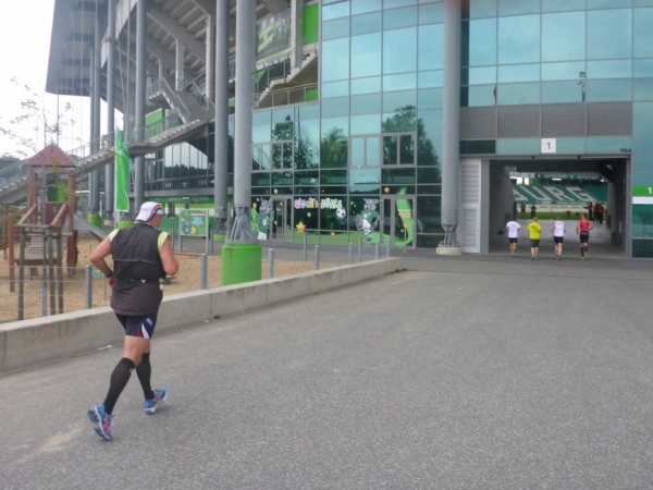 Nun befand ich mich auf dem Gelände des Allerparks und staunte nicht schlecht, worauf ich da gerade zulief. „Ach was, wir werden doch jetzt nicht etwa durch die…“, begann ich laut murmelnd. Und ob, hier hatte sich die Orga anscheinend mit dem Fußballspielplan des Vfl abgestimmt, denn der nächste Wow-Effekt folgte: während draußen ein Zuschauer mit Trillerpfeife für die authentische Stimmung sorgte, rannte ich direkt durch die VW-Arena und nah an Naturrasen und Tor vorbei. Im inneren spielte ein Saxophonist, die Klänge hallten dementsprechend durch die Reihen der Tribünen. What a feeling! Siegreich hob ich meine Arme, ließ mich von einer imaginären Zuschauermenge feiern – das musste sein, Kopfkino halt!