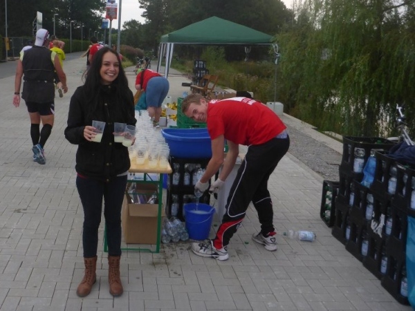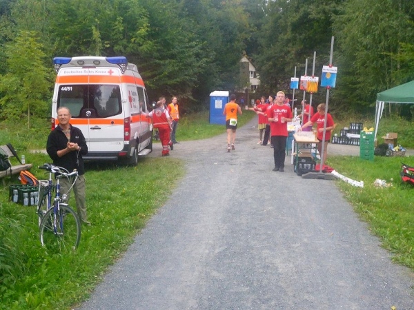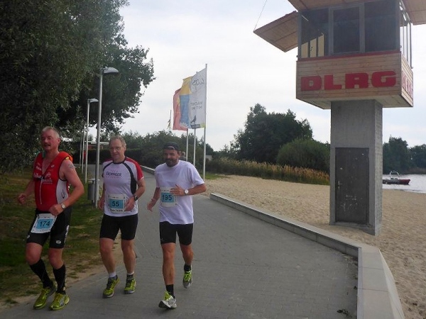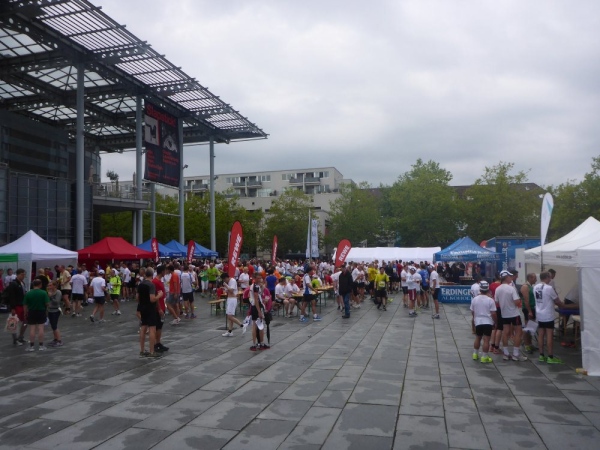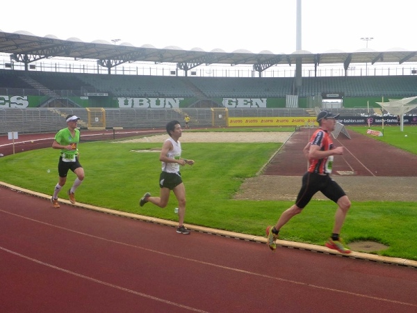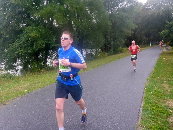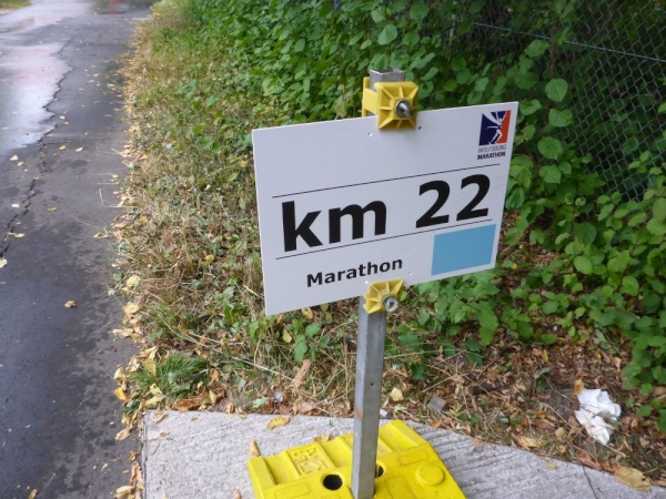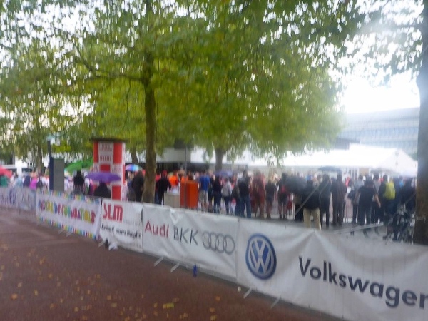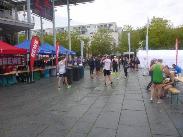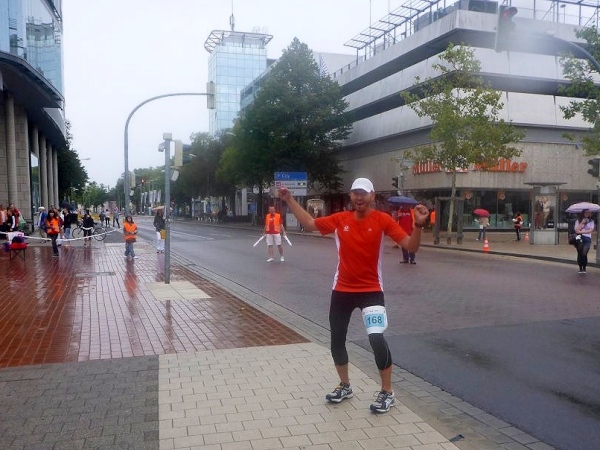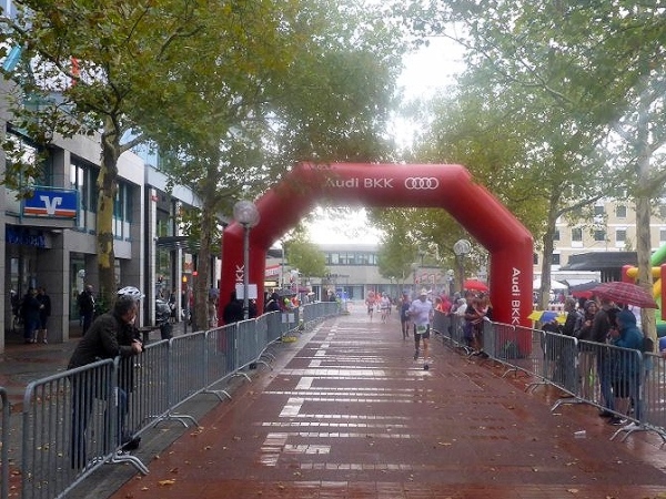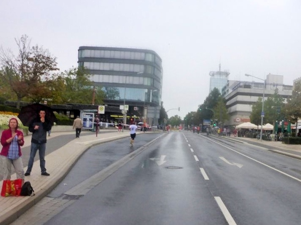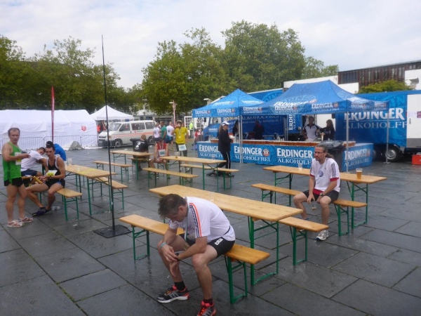Der angesprochene Regen überraschte mich nicht, war ja bloß eine Frage der Zeit. Ich musste an die beiden Mädels denken, die während ihres 10km-Laufs den gut anderthalbstündigen Schauer ebenfalls abbekommen würden. Naja, die beiden waren ebenso wenig wie der Rest der Läufer aus Zucker, mal ganz zu schweigen von den geschätzten 15000 Zuschauern während der gesamten Dauer der Veranstaltung, die da einfach ihre Regenschirme auspackten und uns Sportler weiter anfeuerten. Da hockte so manch lächelnder Streckenposten völlig durchnässt in den Büschen und hob trotzdem den Siegesdaumen.