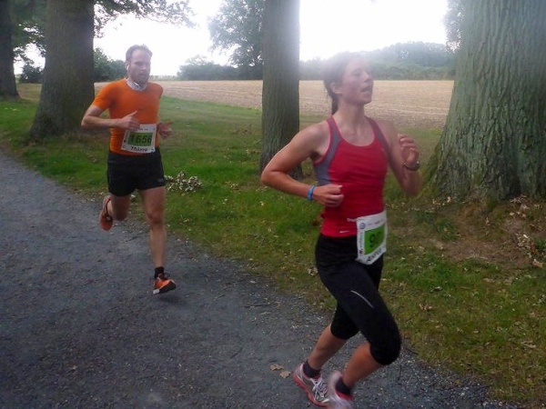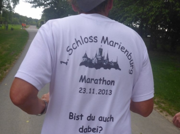 Am künstlich geschaffenen Allersee näherte ich mich einer Läufergruppe. Einer von Ihnen trug ein schief hängendes Käppi sowie auffälliges Shirt mit der rückseitigen Aufschrift „1. Schloss Marienburg Marathon 23.11.2013 – Bist Du auch dabei?“. Ich grüßte in die Runde und erkannte Heinrich Schütte vom 100 Marathon Club. Erstmals hatte ich den Vielläufer im Mai dieses Jahres beim Eulenburg 100 Meilen Trail kennen gelernt. „Den Marathon sollte man nicht verpassen“, erzählte mir Heiner, der als 1. Vorsitzender des VfL Adensen-Hallerburg den Marienburg-Marathon organisierte. „Da läuft man über Dorfstrassen, asphaltierten und nicht asphaltierten Wanderwegen, und auch über Trails. Highlight der VP beim Anstieg zur Marienburg auf dem Schloss-Innenhof. Der hügelige, 21,2 km lange Rundkurs hat die Form einer Acht.“