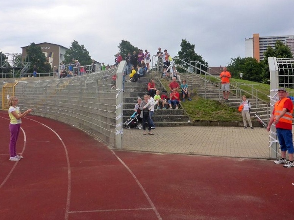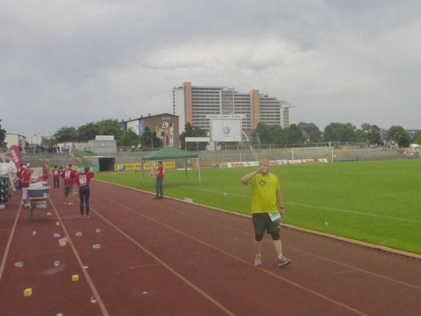 Zugegeben, ich dachte bereits, die Highlights der Strecke gesehen zu haben, aber nicht umsonst führte der Marathon uns zunächst durch Wohngebiet. Hier befand sich nämlich das alte Vfl-Stadion am Elsterweg, dem zurzeit größten Stadion der Frauen-Bundesliga. Hier war es auch, wo Conny Pohlers vor zwölf Jahren als erste deutsche Spielerin fünf Tore in einem Länderspiel erzielt hatte. Eine kleine Gruppe von Zuschauern applaudierte, während wir durch das Stadion liefen. Im inneren wartete bereits der nächste Verpflegungspunkt auf uns. Ich schnappte mir diesmal einen Becher Iso, drehte eine Runde auf der Kampfbahn und dann ging es unter erneutem Jubel der Zuschauer wieder hinaus, raus aus der Stadtmitte Richtung Neuhaus-Reislingen.