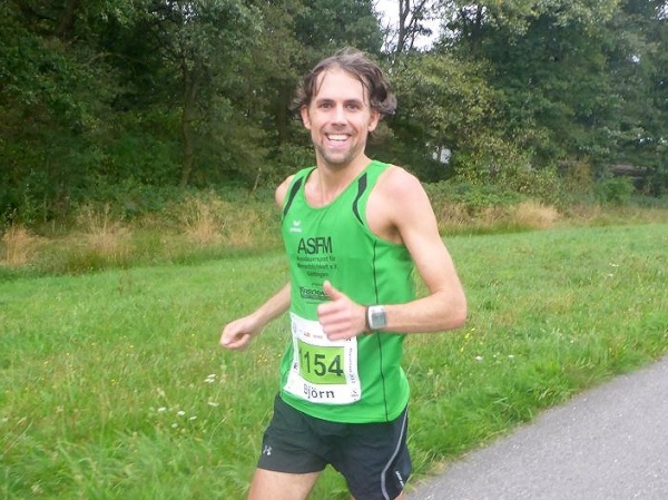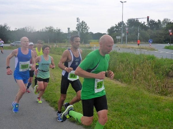Zunächst erneut durch Wohngebiet, führte uns die Strecke dann aber zunehmend durch die ländlichen Außenbezirke von Wolfsburg. „Hi Mario“, rief eine mir bekannte Stimme. Wie von einer Tarantel gestochen raste ein grüner Schemen mit einem Affenzahn an mir vorbei - da war er wieder, der Björn. Er würde später mit 1:23 finishen und sich über eine konstant gelaufene PB freuen. Ich rannte ihm hinterher, schoss ein Foto. „Weiter so, Björn!“, rief ich ihm jubelnd zu, und – zack! - war er wieder weg. Dann musste ich das Tempo drosseln, das war mir dann doch eindeutig zu schnell. Ein kurzer Schulterblick, der Abstand war deutlich zu groß, um zu Heiner’s Gruppe zurück zu fallen.