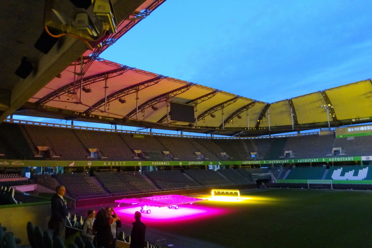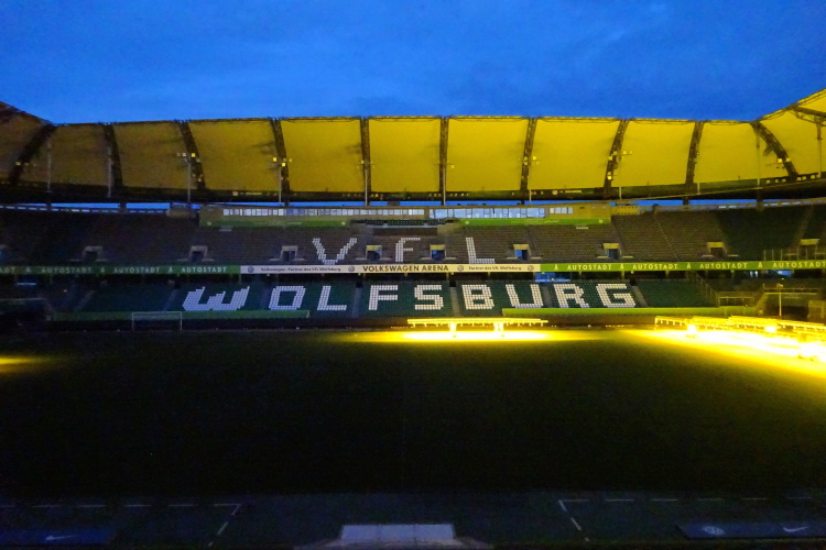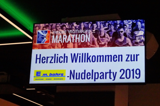 Ich mache einen Abstecher in die Volkswagen Arena, das 2002 gebaute Fußballstadium des VfL, der seit heuer mit Oliver Glasner einen österreichischen Trainer hat und momentan nach drei Runden an dritter Stelle der deutschen Bundesliga liegt. Nach einem gemütlichen Spaziergang treffe ich dort erst 10 Minuten vor dem Ende der Nudelparty um 20 Uhr ein. Der im Startsackerl enthaltene Bon wird beim Eingang verlangt, gerade hat eine Küchenhelferin die Pfanne mit herrlich dampfenden Nudeln nachgefüllt. Vom Restaurant aus kommt man auf die oberen Tribünen hinaus, einzelne Abschnitte bzw. Sektoren des Stadions werden mit buntem Licht angestrahlt, ein imposanter Anblick und bleibender Eindruck – zumal morgen auch der Marathon durchs Stadion führen wird.