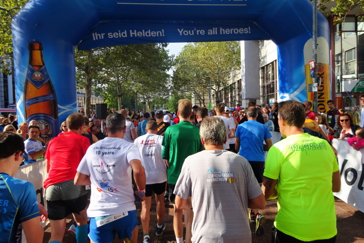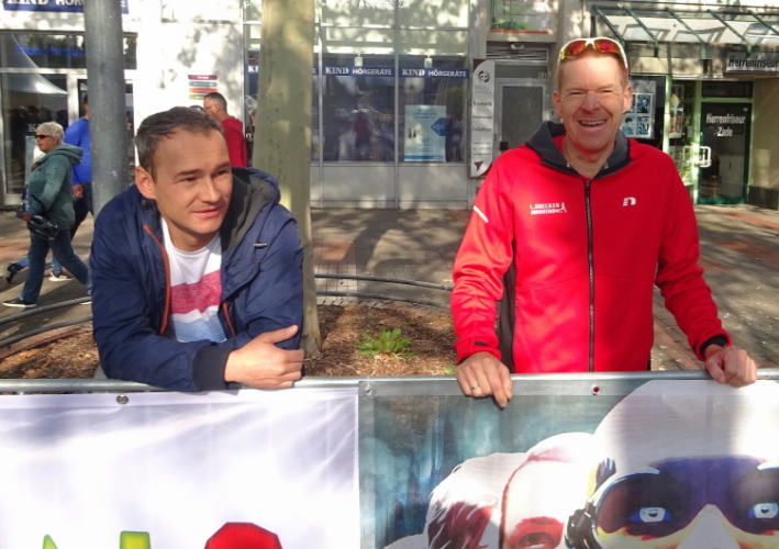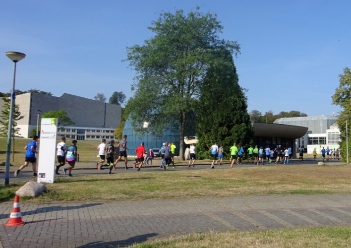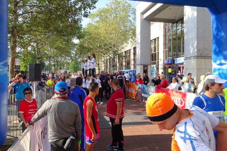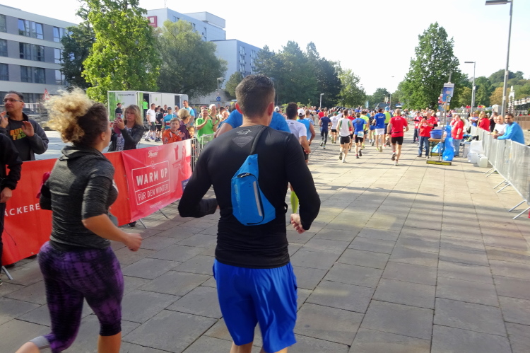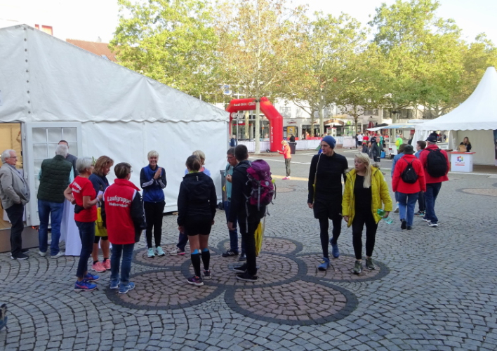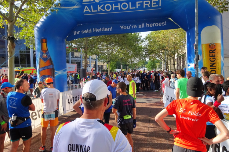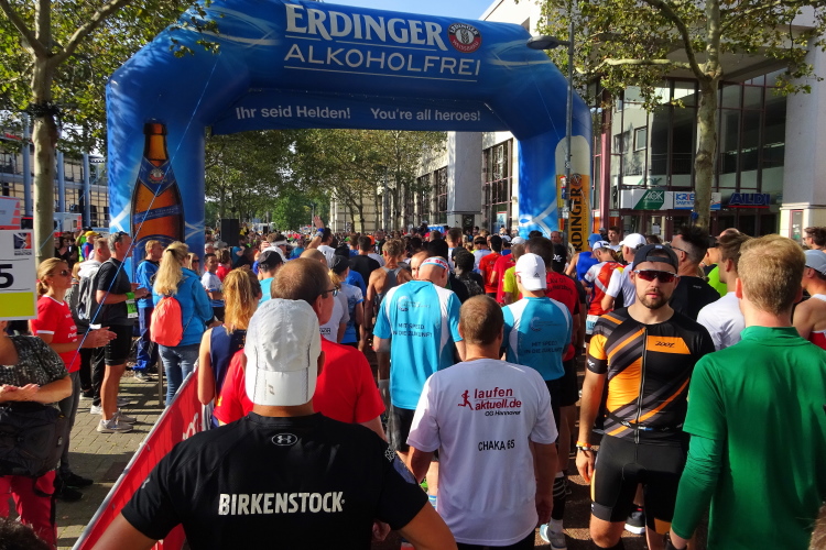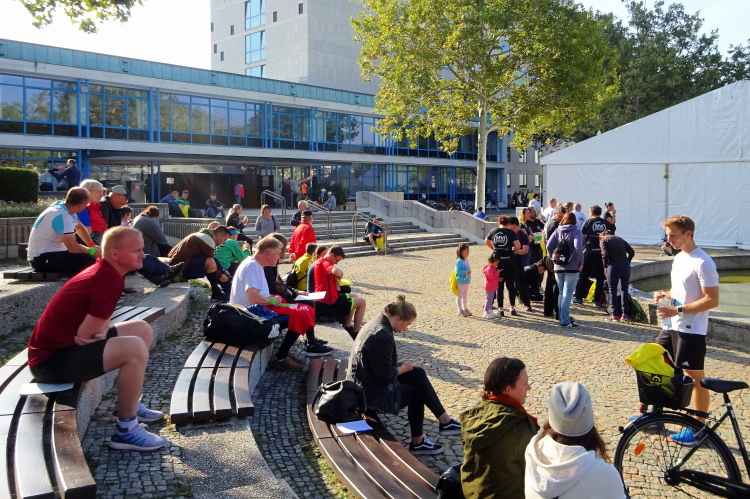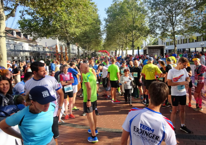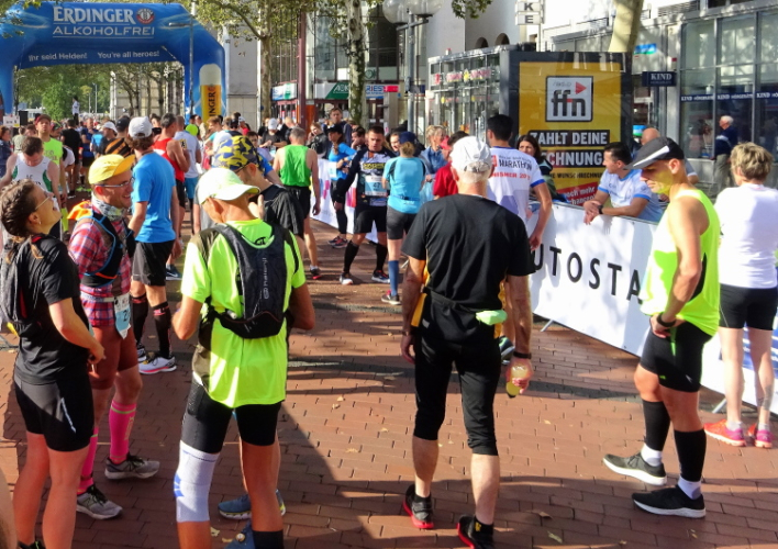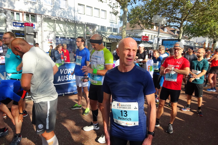 Gegen 09 Uhr 15 mache ich mich auf den Weg zum Startareal auf dem ca. 800 m entfernten Rathausplatz. Es wird ein warmer Tag, bis zu 18 Grad C sind angesagt. Die Marathonläufer haben blau unterlegte Nummern, beim gestrigen kurzen Check der Liste am Aushang in der VfL-Sporthalle waren knapp über 200 Läuferinnen und Läufer gemeldet.