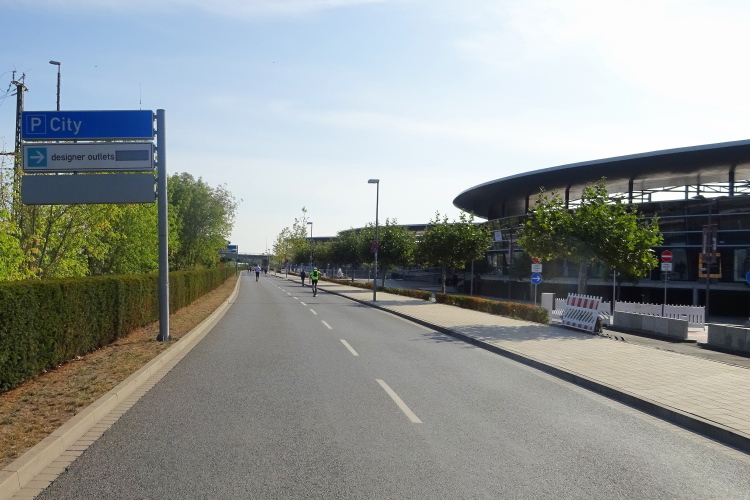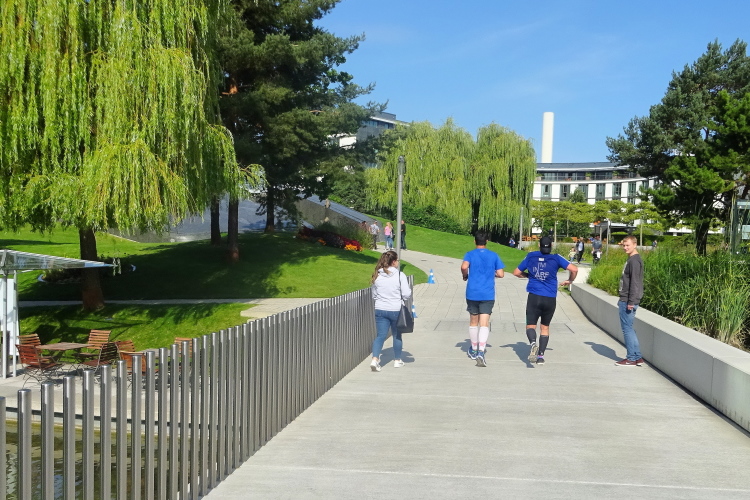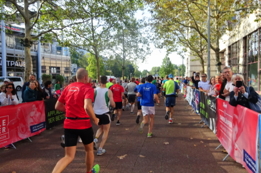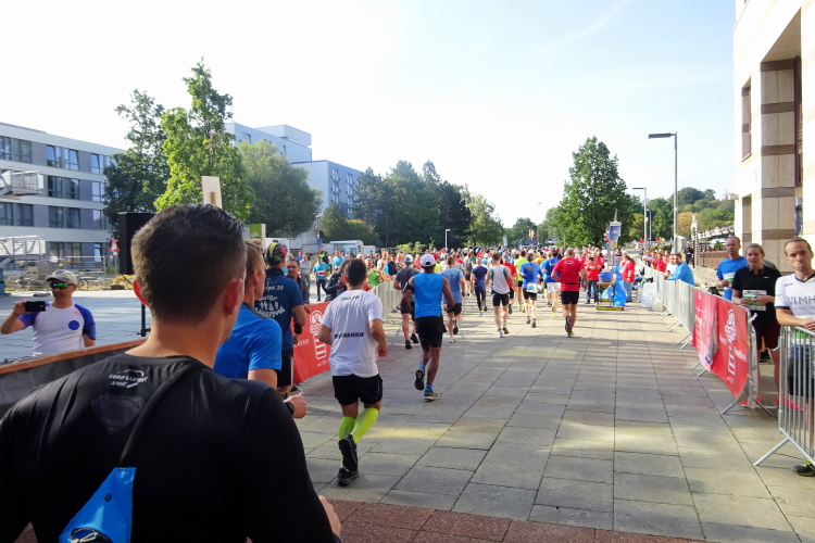 Der Ordner deutet an, dass die Läuferinnen und Läufer nun in die Fußgängerzone, die entlang der Porschestraße zum Hauptbahnhof verläuft, einbiegen sollen. Inzwischen sind auch einige Zuschauer zu sehen, die an der Absperrung stehen und applaudieren. Wir kommen vorbei an dem zu unserer Linken, von der international bekannten, irakisch-britischen Architektin Zaha Hadid geplanten und 2005 eröffneten futuristisch anmutenden Science Center Phaeno, ein Gebäude aus Beton und Stahl, das heute u.a. als Bildungszentrum genutzt wird.