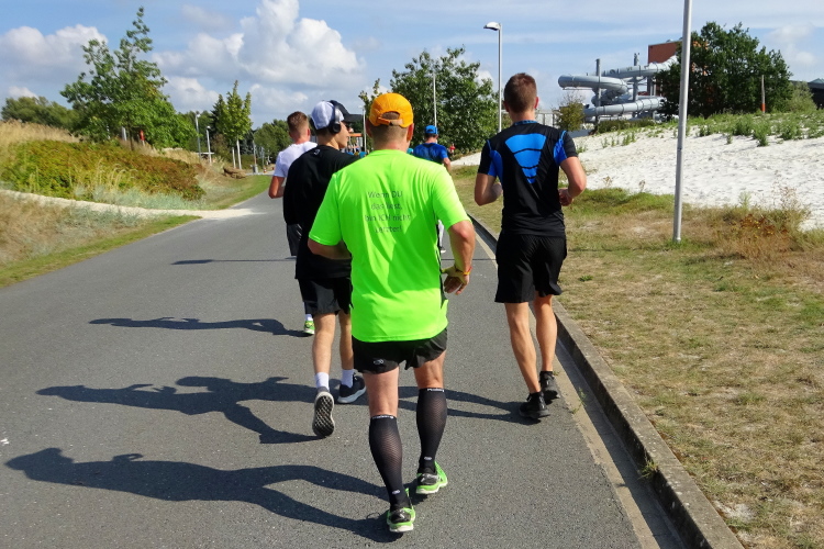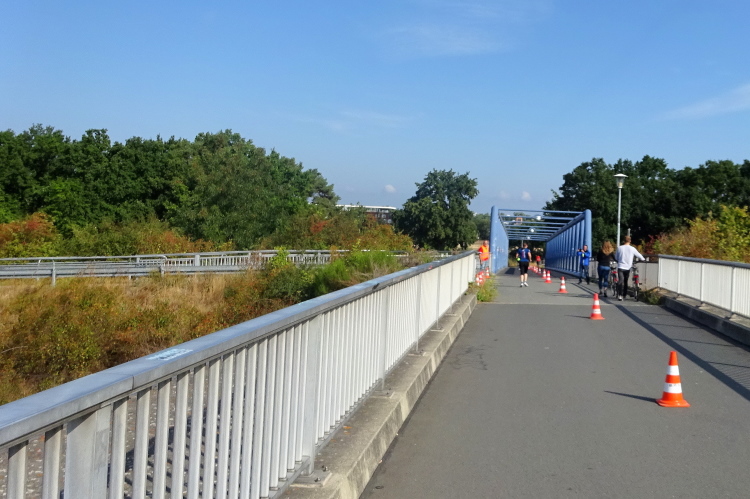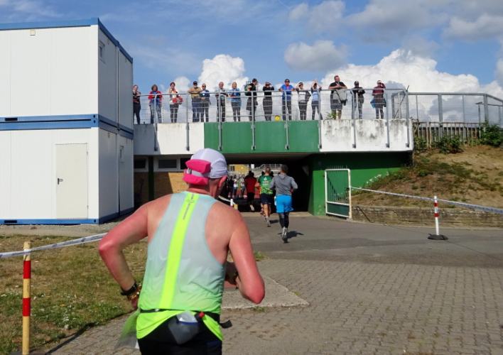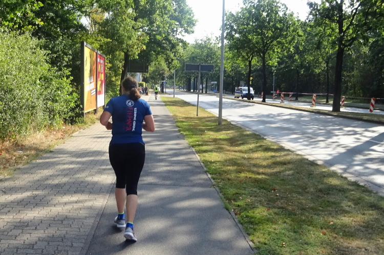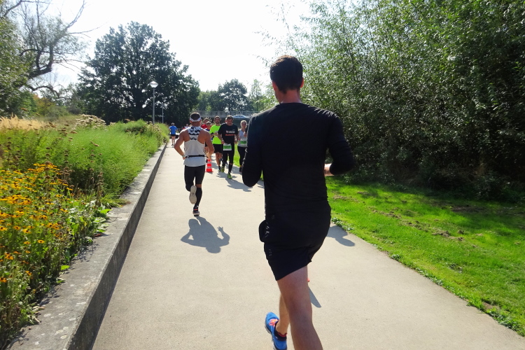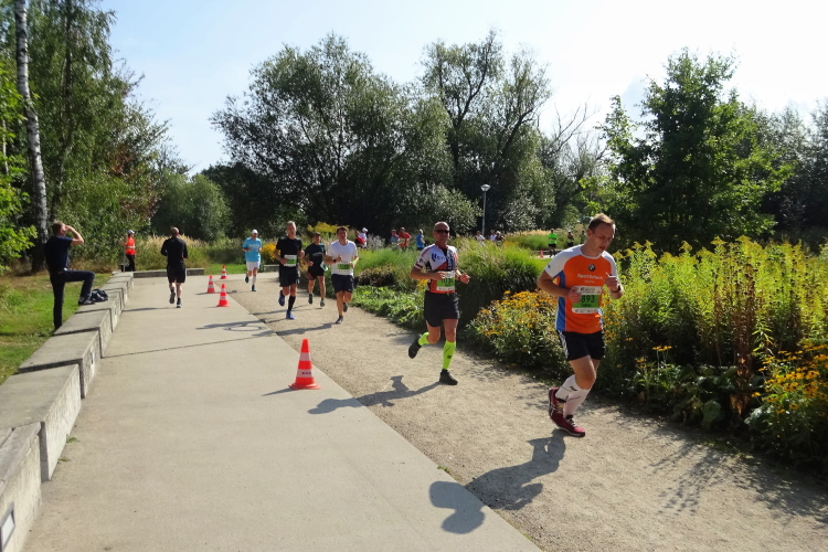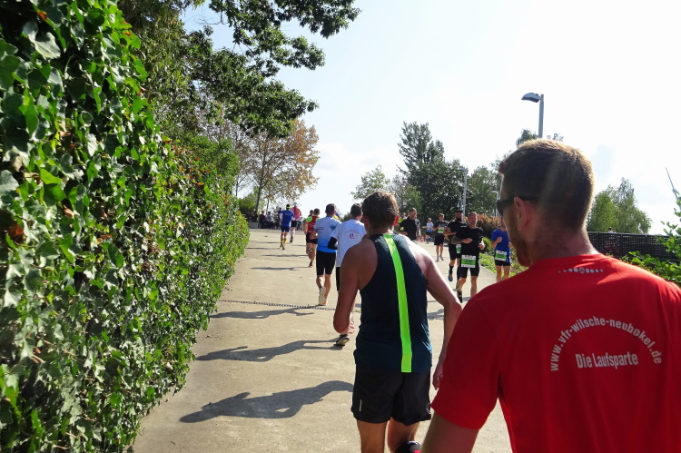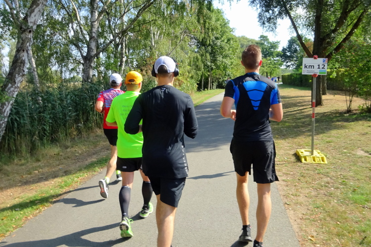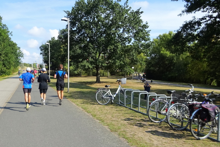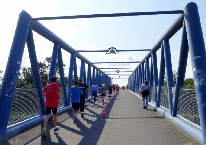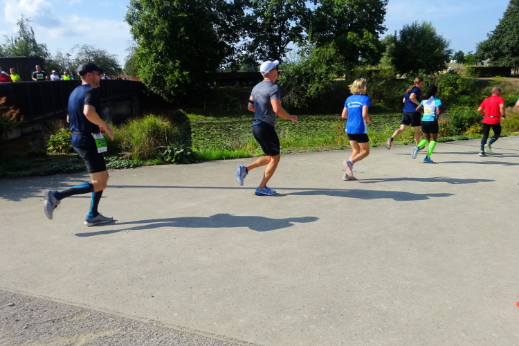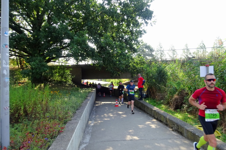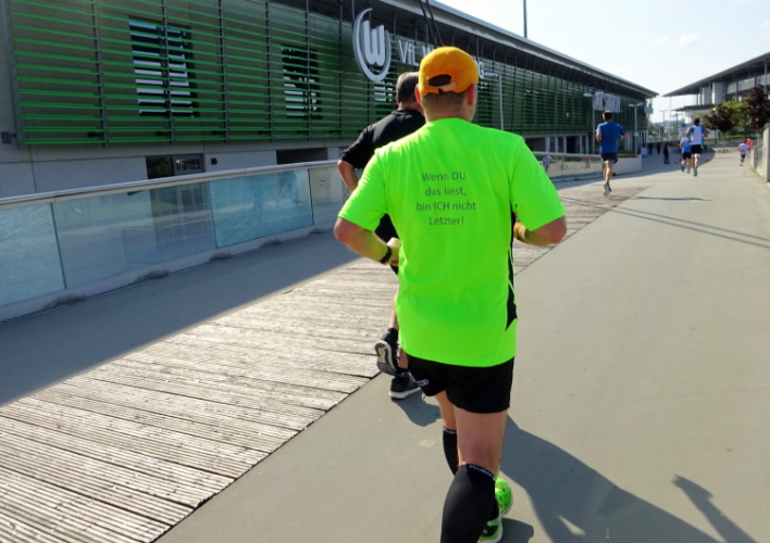 Nun geht es wieder zurück über den Mittellandkanal, auf der Brücke überholt mich ein Kollege in langsamem Laufschritt . Auf seinem grünen Shirt steht: „Wenn du das liest, bin ich nicht Letzter!“ Einen größeren Ansporn brauche ich nicht, um an ihm dranzubleiben. Auf der gegenüberliegenden Seite kommen noch viele Halbmarathonläufer nach, sie liegen ca. 4 km zurück, aber noch immer sehr gut in der Zeit.