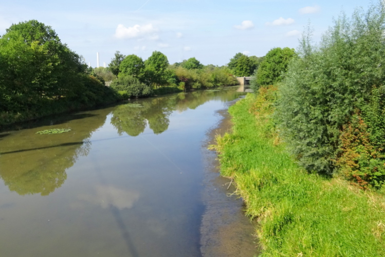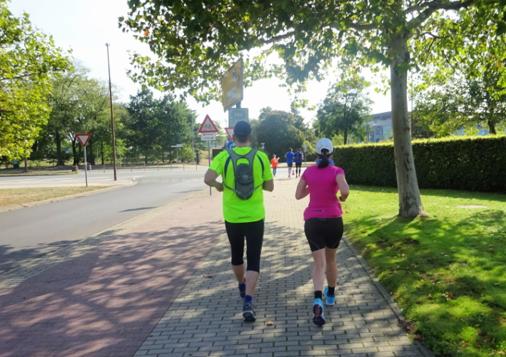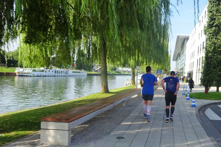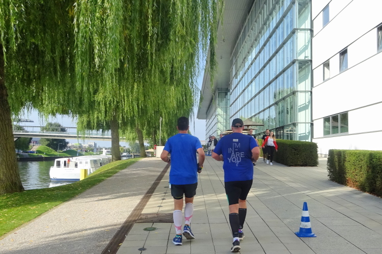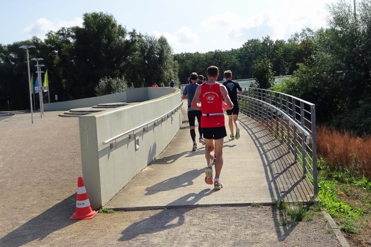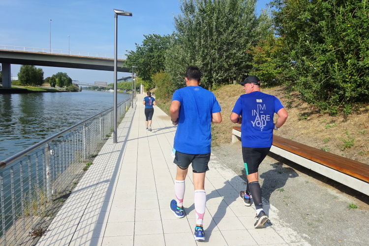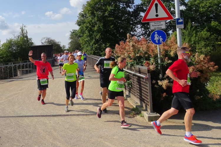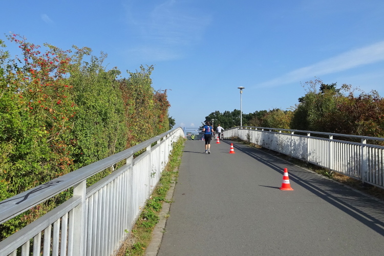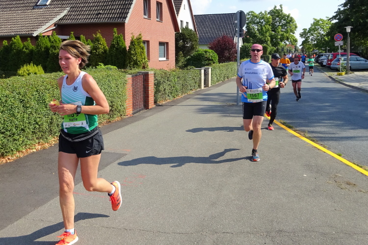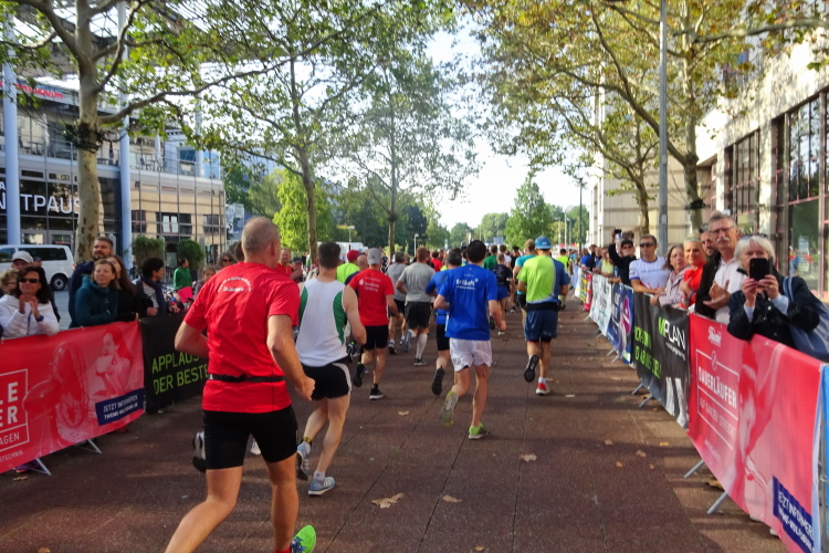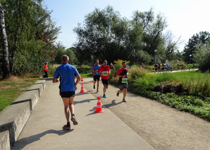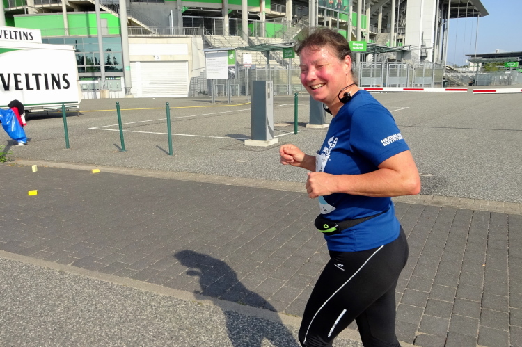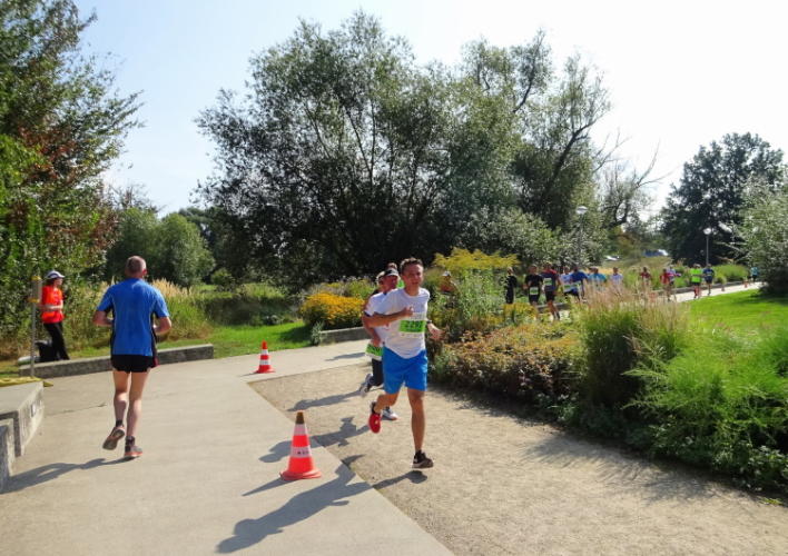 Nun geht es wieder zurück über den Mittellandkanal, auf der Brücke überholt mich ein Kollege in langsamem Laufschritt . Auf seinem grünen Shirt steht: „Wenn du das liest, bin ich nicht Letzter!“ Einen größeren Ansporn brauche ich nicht, um an ihm dranzubleiben. Auf der gegenüberliegenden Seite kommen noch viele Halbmarathonläufer nach, sie liegen ca. 4 km zurück, aber noch immer sehr gut in der Zeit.