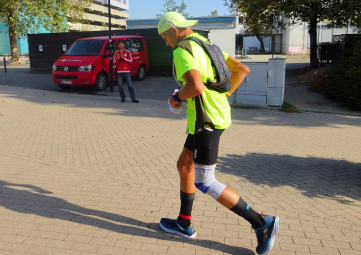 Bei der Labe nahe der Arena erblicke ich endlich einen langsamen Kollegen, der mich fragt, ob wir es im Gehen in der Zeit schaffen werden. Ich antworte: „Du nicht, aber ich schon!“ Diese knallharte Aussage beflügelt den jungen Mann derart, dass er wie nach einem Zaubertrank bei den Galliern neue Kräfte mobilisiert und wegspurtet. Ich bleibe Letzter. In einer Siedlung im Waldgebiet verjüngt sich die Straße, die beiden Autos kommen nicht durch. Aber der Fahrer kennt sich aus, er reversiert und kommt aus einer Nebenstraße wieder nach.
