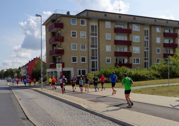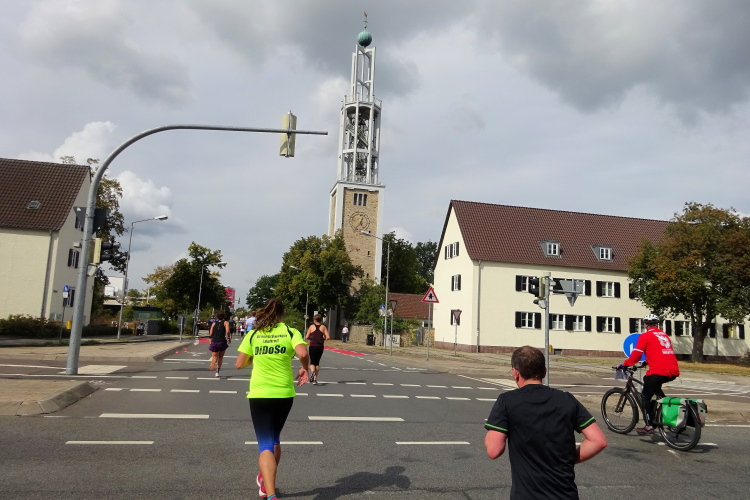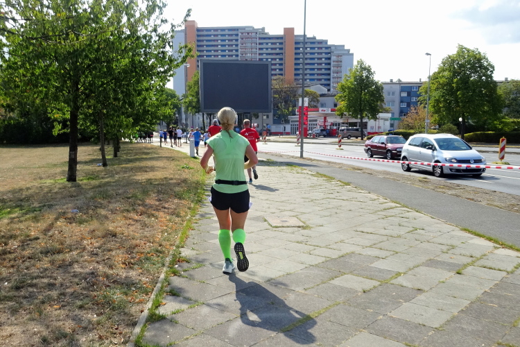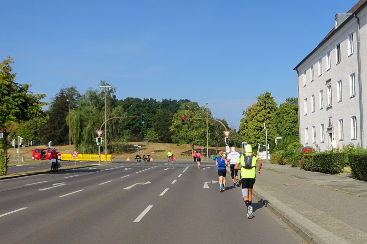 Der Kurs führt nun ein kurzes Stück am Berliner Ring vorbei nach Osten, die Polizei sperrt bzw. regelt den Verkehr gemäß dem Läuferaufkommen. Ich wundere mich nun schon seit einigen Minuten, warum ein offizieller Begleitradfahrer für die Schlussläufer an mir dranklebt. Auf die Frage nach dem Warum entgegnet dieser, dass der Letzte im Feld wahrscheinlich nicht mehr die geforderten drei Stunden für den Halben schaffen wird und ich die rote Laterne hätte.