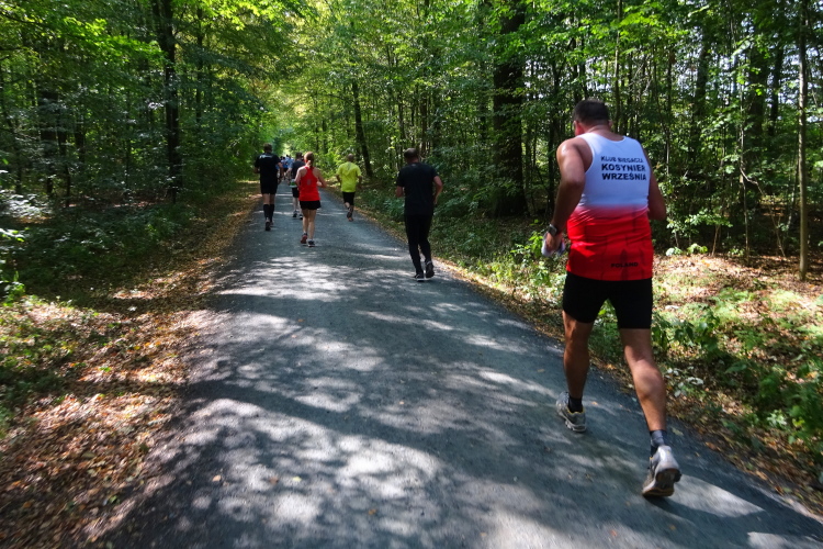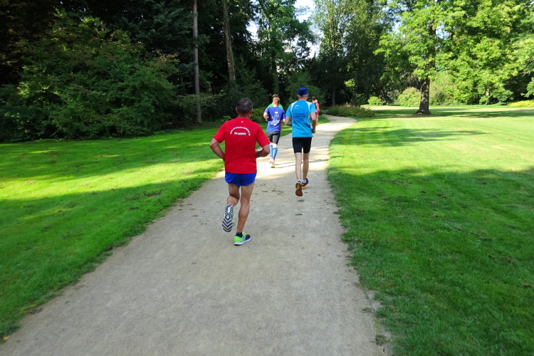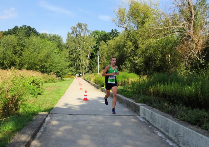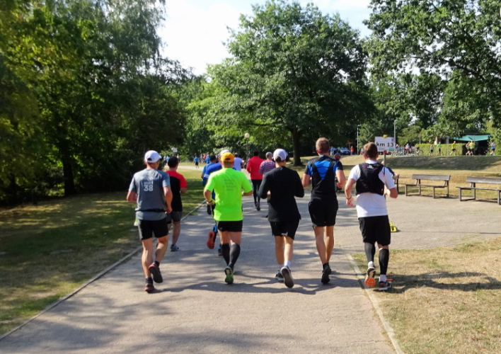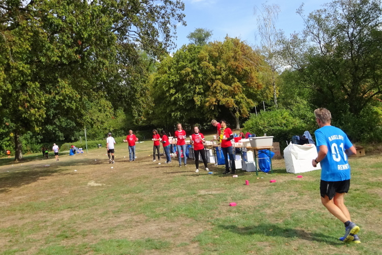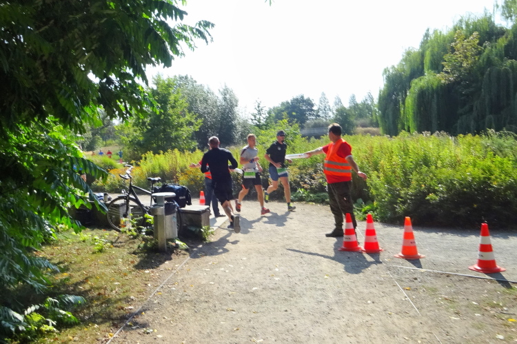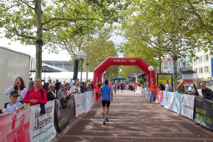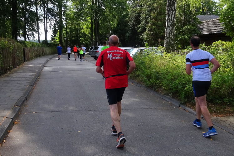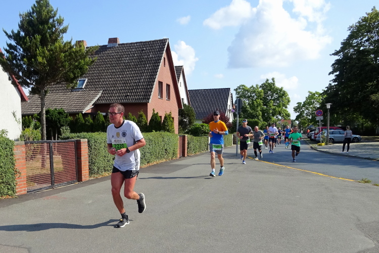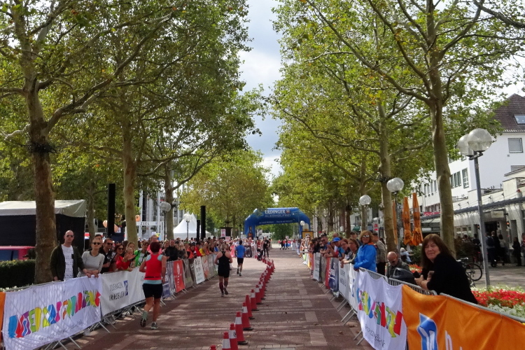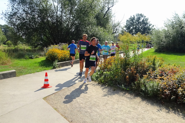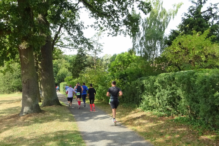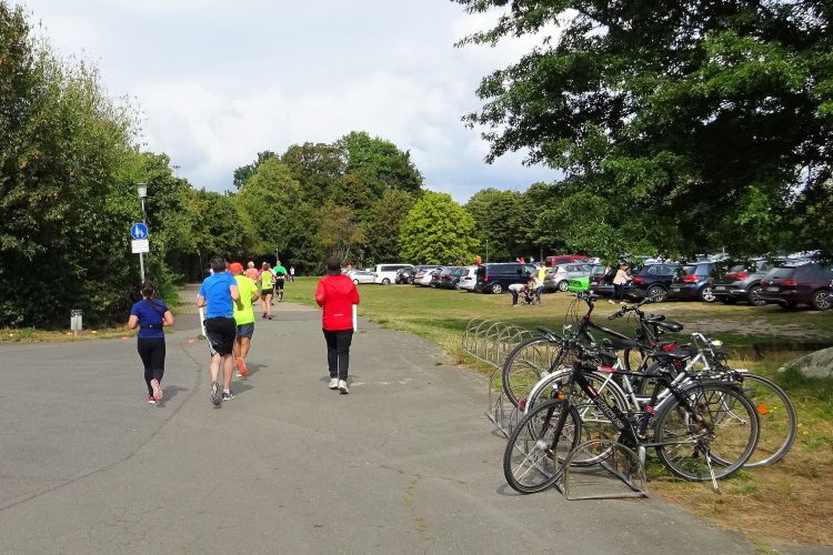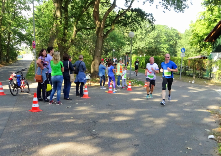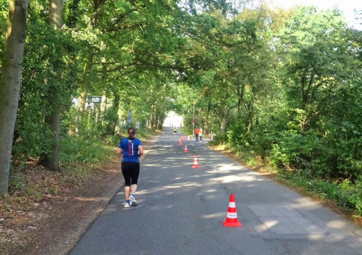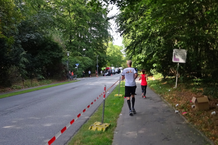 Beim Steimker Berg steigt die Strecke leicht an, einige Höhenmeter sind auf einem typischen befestigten Waldweg zu überwinden. Der Begleit-Radfahrer nutzt ein E-Bike. Er erzählt, dass er wegen Knieproblemen das Laufen aufgegeben habe. Viele Wanderer und Ausflügler sind unterwegs. Sowohl Anstieg als auch Untergrund bremsen mich, auf dem letzten Kilometer auf der Pestalozziallee ins Zielareal versuche ich wieder Tempo zu machen. Als ich die zweite Runde beginne, höre ich, inzwischen einen Kilometer vom Ziel entfernt, wie der Sieger bei den Herren mit 02:46 Stunden unter Beifall des Publikums finisht.