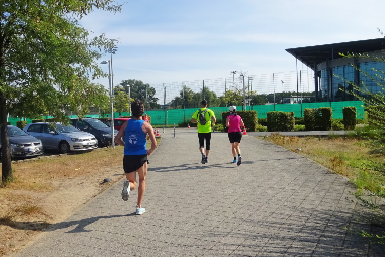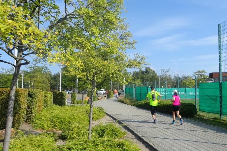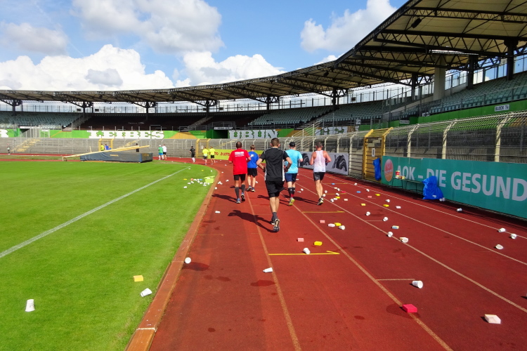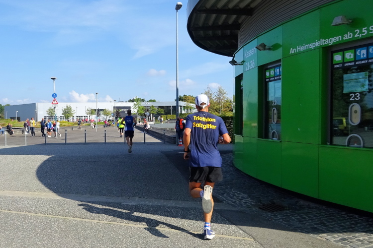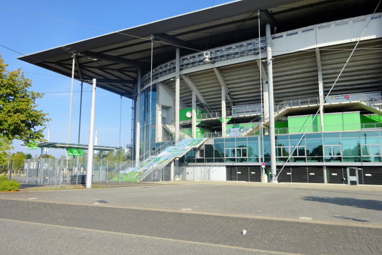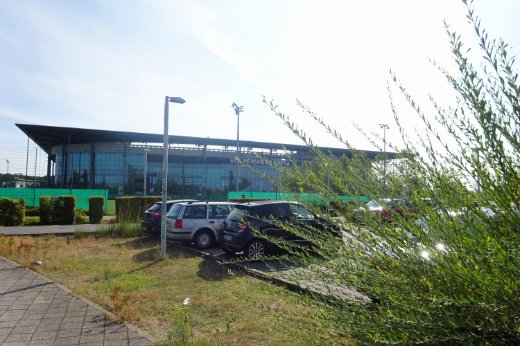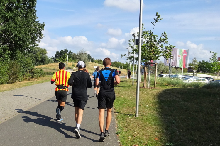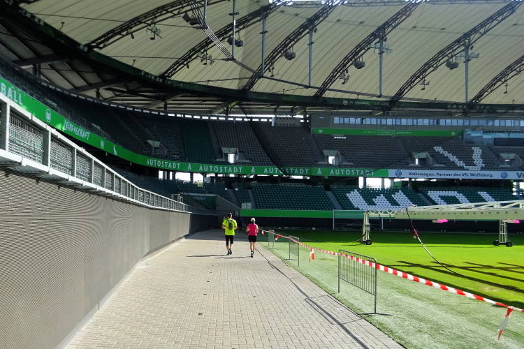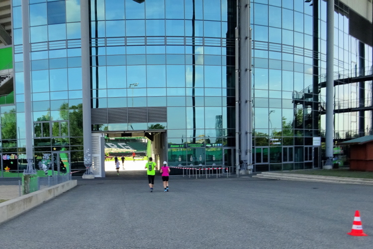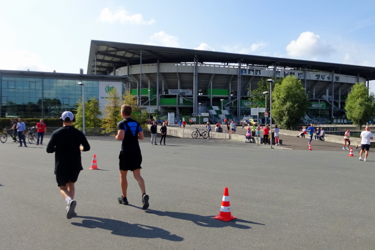 Der Marathonkurs führt weiter durch das Areal der Autostadt, zwei weitere Nachzügler schließen bei Kilometer 8 zu mir auf. Ihr konstantes Tempo ist zu hoch für mich, ich falle etwas zurück. Es geht wieder am Berliner Ring entlang in Richtung zum 2002 eröffneten Fußballstadion des VfL Wolfsburg, wo gestern Abend die Nudelparty stattfand. Wir laufen durch die 30.000 Zuschauer fassende Sportanlage. Riesige Sprinkleranlagen auf Rädern zur Bewässerung des herrlich grünen Rasens stechen ins Auge. Einer der schnellen, um 10 Uhr 30 gestarteten Halbmarathonläufer, stürmt an mir vorbei, die Nachzügler von vorhin gewinnen ebenfalls an Boden.