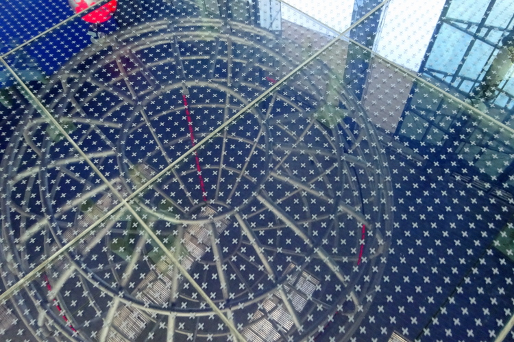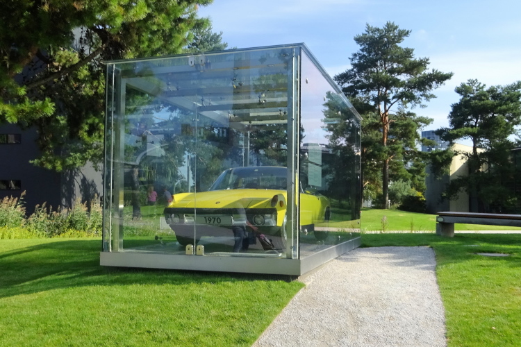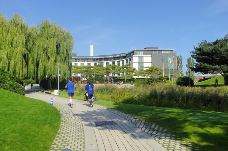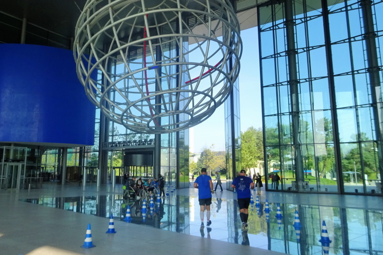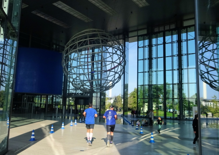 Am Kanal entlang führt der Marathonkurs nun in Richtung Autostadt, die insgesamt Erlebniswelt, Auslieferungszentrum für Neuwagen, Museum und Freizeitpark der Volkswagen AG in unmittelbarer Nähe des Volkswagenwerks ist. Im Starterpaket befanden sich auch zwei Eintrittskarten in Kreditkartenformat, die immerwährend gültig sein sollen. Imposant ist die riesige Empfangshalle mit einem 4,5 Tonnen schweren „Erdkugel“ aus Aluminium an der Decke. Wir laufen drunter durch. Viele Sonntagsbesucher sind hier vor dem Gebäude und in den Hallen bereits anzutreffen. Sie interessieren sich für die Objekte, Oldtimer aus den Jahrzehnten, jedoch kaum für die Läuferinnen und Läufer.