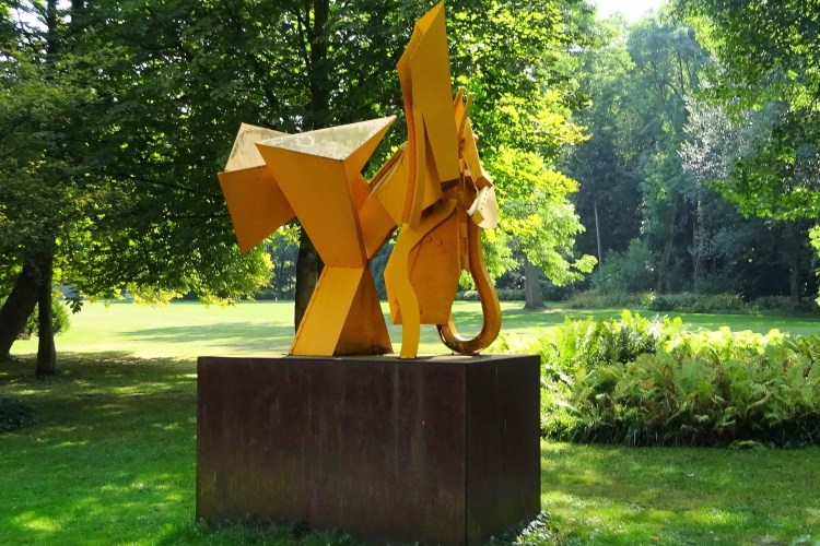 Eine Parkrunde mit einer Begegnungsstrecke steht an. So schön dieser grüne Abschnitt im Allerpark für Spaziergänger auch sein mag, ich weiche dem sandigen, tlw. steinigen Untergrund auf die angrenzende Wiese entlang der Trasse aus. Im Park liegt auch das Schloss Wolfsburg, eine 1302 erstmals urkundlich erwähnte, mittelalterliche Niederungs- und Wasserburg, die sich später in ein Renaissance-Schloss wandelte und nach dem die Stadt Wolfsburg benannt ist. Die 10 km-Anzeige ist auf der kleinen Brücke vor dem Schloss aufgestellt. Von dem in Berlin lebenden Bildhauer Thomas Kiesewetter stehen im Park mehrere Skulpturen, darunter eine in Gelb, die man in freier Weise als Elefant interpretieren könnte.