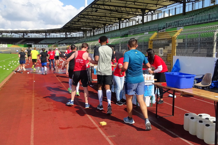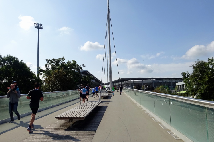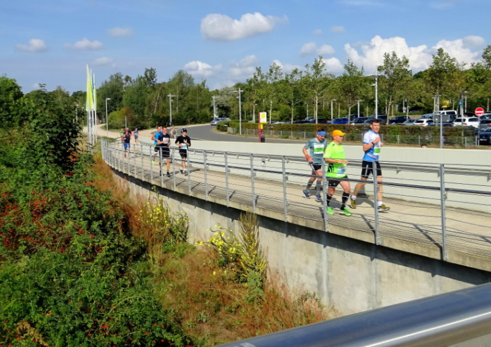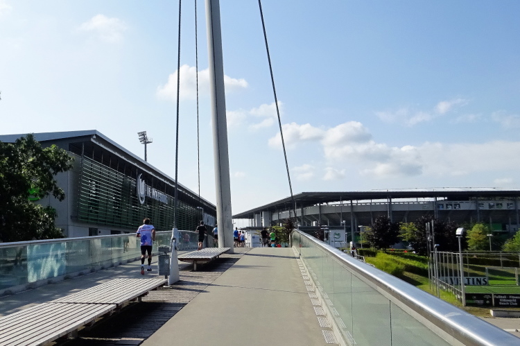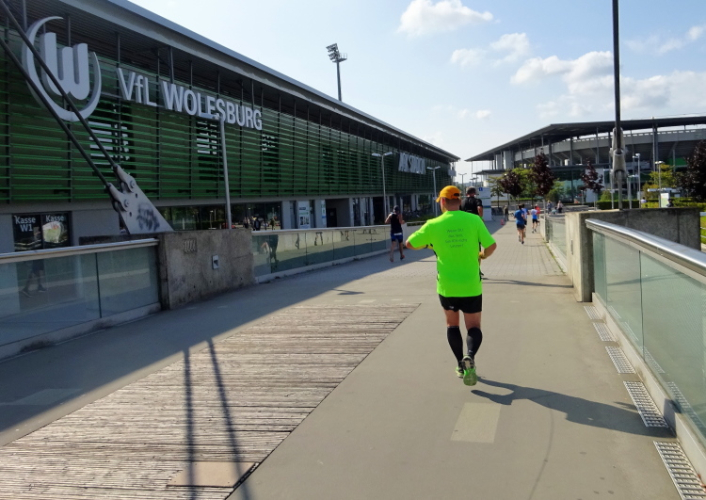 Entlang der Bahnstrecke geht es durch Industriegebiet weiter in östliche Richtung. Unter den Autobahnzubringern beim Berliner Ring hindurch führt der Marathonkurs auf der ersten von zwei identischen Runden nun weiter. Eine Läuferin hat sich an mich herangekämpft – wenn man bei meiner Kilometervorgabe noch von „Kampf“ sprechen darf. Sie erzählt, dass dies heute ihr erster Marathon sei und nimmt an, dass ich schon mehr Lauferfahrung habe. In der Tat, auf 400 Marathons fehlen mir nur mehr wenige. Auf dem leicht ansteigenden Fußgänger- und Radfahrweg über den Mittellandkanal, der später zu einer Begegnungszone werden wird, eilt sie mir dann davon. Aber beim Brückengefälle auf der anderen Seite hole ich sie wieder ein. Als wir zur Labe vor der Südtribüne der Volkswagen Arena kommen, schließen zu uns zwei Läufer aus der Nachhut auf. Die Versorgung ist üppig, Wasser, Iso, Cola, Gels, Bananenstücke. Noch sind die Halbmarathonis, die um10 Uhr 30 gestartet sind, nicht in Sicht.
