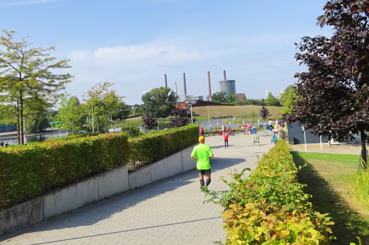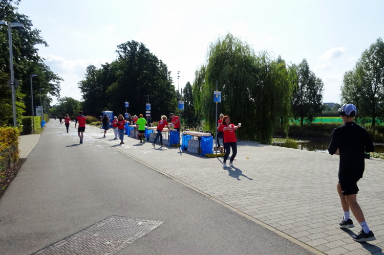 Sobald wir aus dem Stadion kommen, führt die Marathonstrecke am Wake Park, ein künstlich angelegter See im Allerpark Wolfsburg, der als Wassersportzentrum 2005 eröffnet wurde, vorbei. Kilometeranzeigen beim Marathon habe ich bisher keine gesehen, meine Uhr zeigt 9 km an. Die heranstürmenden Halbmarathonläufer – Frauen sind noch keine in Sicht – werden immer zahlreicher. Kaum einer von denen bleibt an der Labestelle stehen – ich schon: Wasser, Iso und Cola im Becher gemischt dient als Energienachschub.