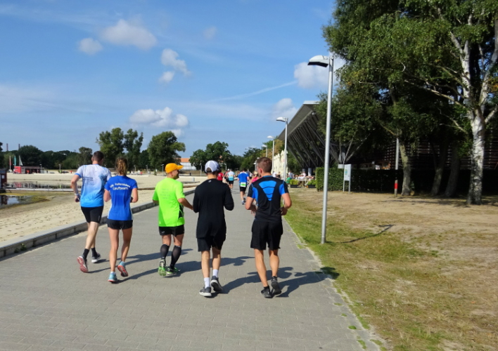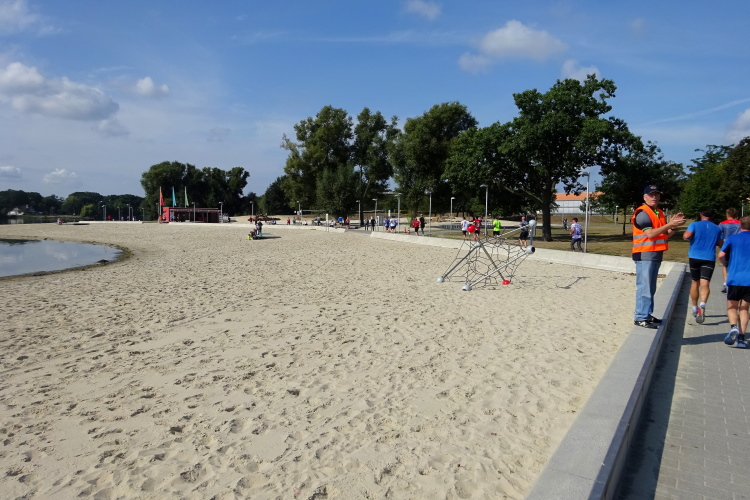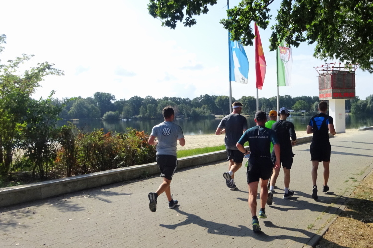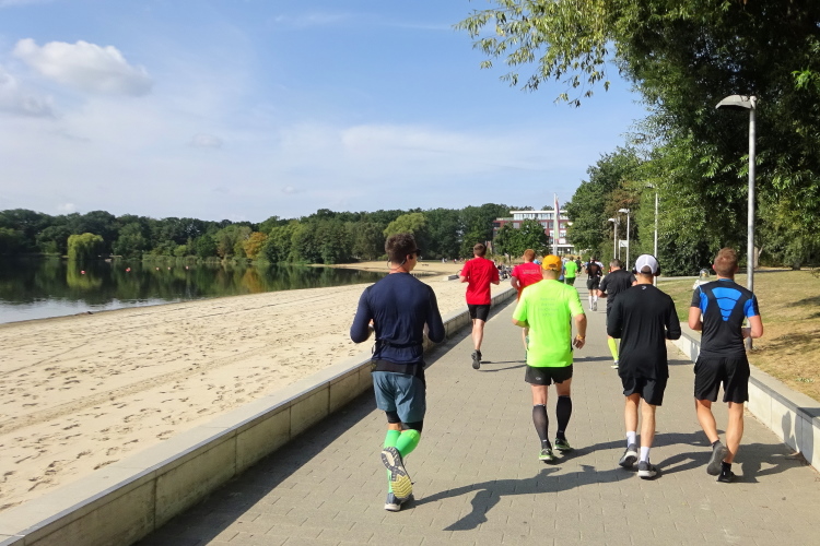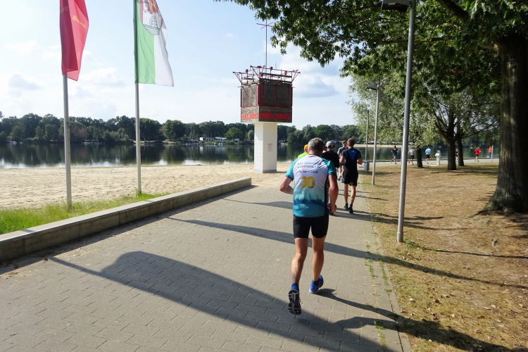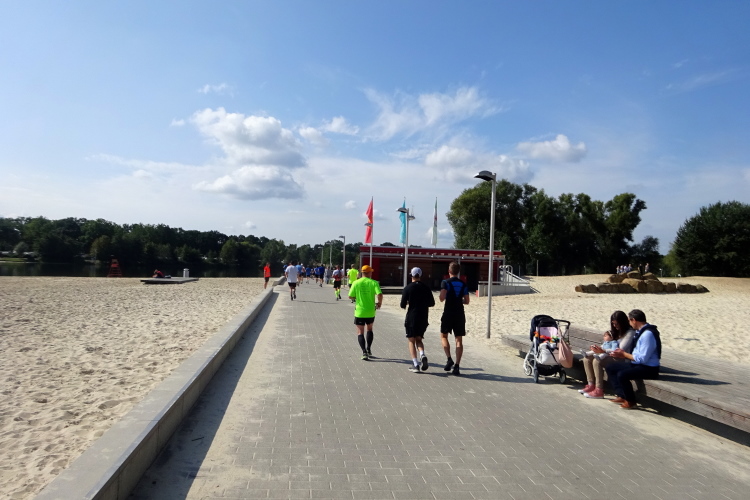 Der Kurs führt anschließend wieder aus dem Park heraus, zurück in die Nähe der VW-Arena. Ich bekomme entlang der Begegnungsstrecke die entgegenkommenden Halbmarathonläufer gut ins Bild. Auf der großen Runde um den Allersee mit echtem Sandstrand und herrlicher Badeinfrastruktur ist es so weit: Joachim (er läuft den Halbmaathon) überholt mich und schreit, dass ich für die angestrebten 5:30 Stunden gut in der Zeit liege und der letzte Marathonläufer ca. 2 km zurückliege.