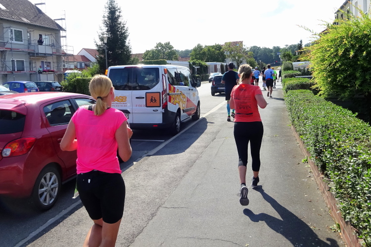 Ich stelle mich ins hintere Feld, 10 Sekunden nach dem Startsignal komme ich schon zur Matte. Wie schnell die alle davonziehen. Mit einem älteren Kollegen, der wie ich links eine Kniebandage hat, komme ich ins Gespräch. Er läuft am Anfang unter 7 min/km, eine Zeit, die ich auf Dauer nicht mehr schaffe, zu sehr spüre ich den Schmerz im inneren Kniebereich bei Dauerbeanspruchung. Der Kollege erzählt, dass auch er einen Knorpelschaden habe. Aber er läuft unverdrossen weiter, die einen (Bewunderer) würden sagen „ein harter Kerl“, die anderen (Mediziner) „völlig unvernünftig“.