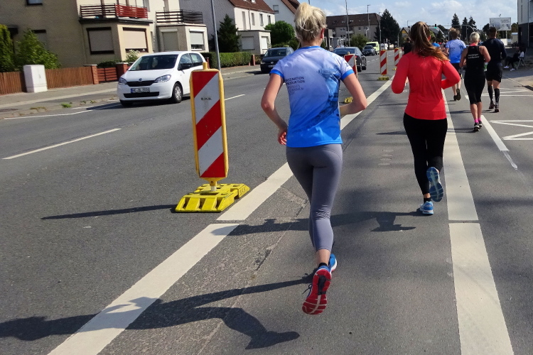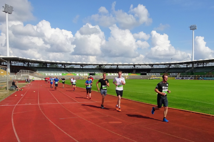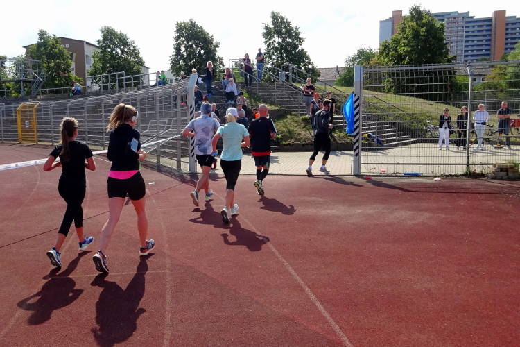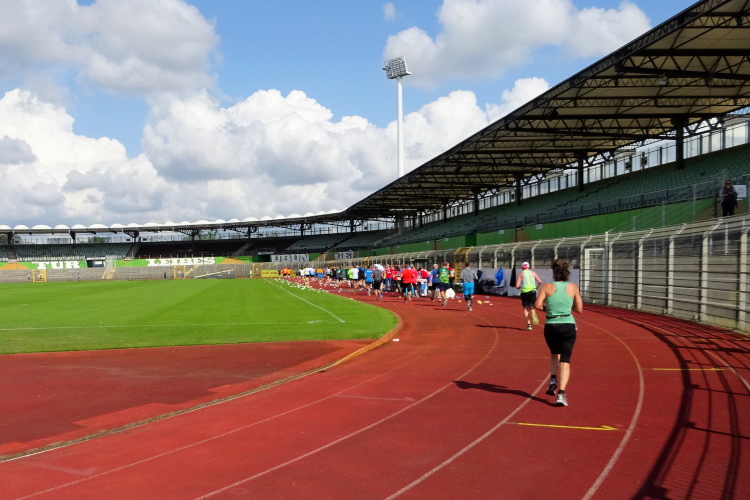 Durch Wohngebiete geht es nun weiter in südliche Richtung in den Stadtteil Hellwinkel. Der Marathonkurs führt in das VfL Stadion am Elsterweg. Auf einer Tartanbahn zu laufen, auch wenn es nur eine Runde ist, beflügelt.