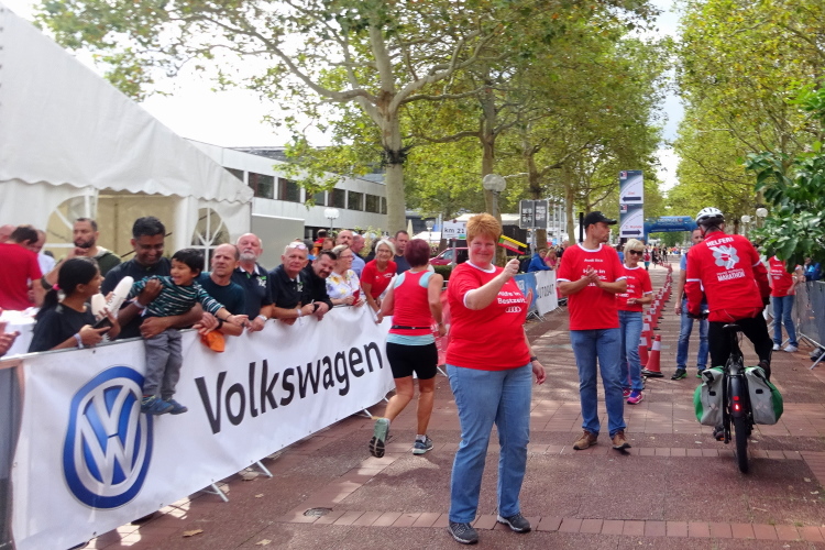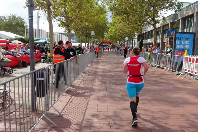 Bei der Autostadt übernimmt seine Frau die Radbegleitung, er ist beim um 15 Uhr beginnenden Kinderlauf eingesetzt. Der Radbegleiterin schließt sich alsbald ein weißes Begleitfahrzeug an, das unverdrossen uns auch auf dem Radweg nachfährt. Und bald darauf schließt sich uns auch der dem VW-Bus folgende Rettungswagen an. Welche Ehre, welch eine Eskorte für den Schlussläufer!