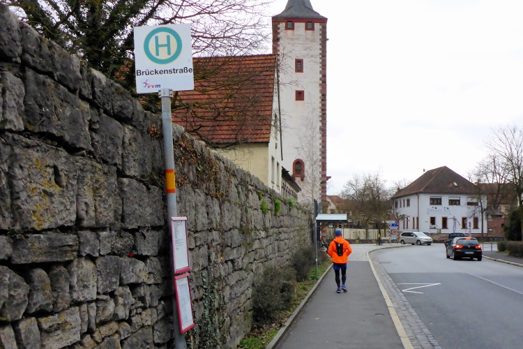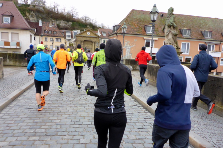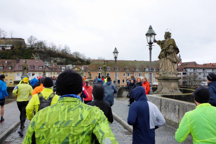 Ich ringe auch nach Luft, weil ich wie immer mit den Kurzstrecklern mithalten will, und der Anstieg zur Alten Brücke bevorsteht. Als man diese Brücke 1120 baute, fand man die Statue der heidnischen Göttin Freya, die von den Missionaren Kilian, Kolonat und Totnan gestürzt wurde. Sie ist nun im Innenhof der Festung Marienberg zu sehen. Die Festung Marienberg, die über den Köpfen der Läufer zu sehen ist, war in der Zeit der Bauernkriege wichtig gewesen. 1945 befand sich dort eine „Umschulungsstätte für arbeitslose SA-Kameraden“. Da muss ich jetzt grinsen, weil diese Kameraden „arbeitslos“ wurden.