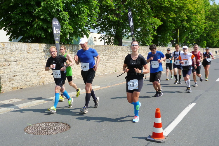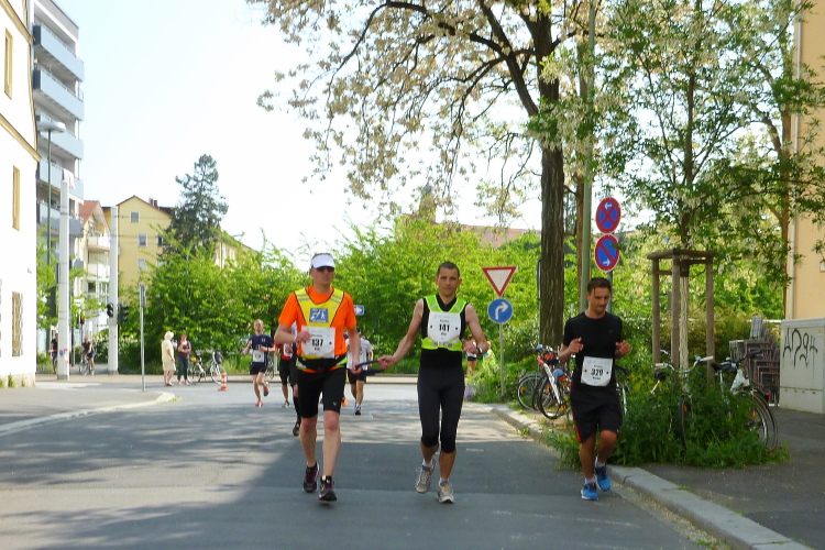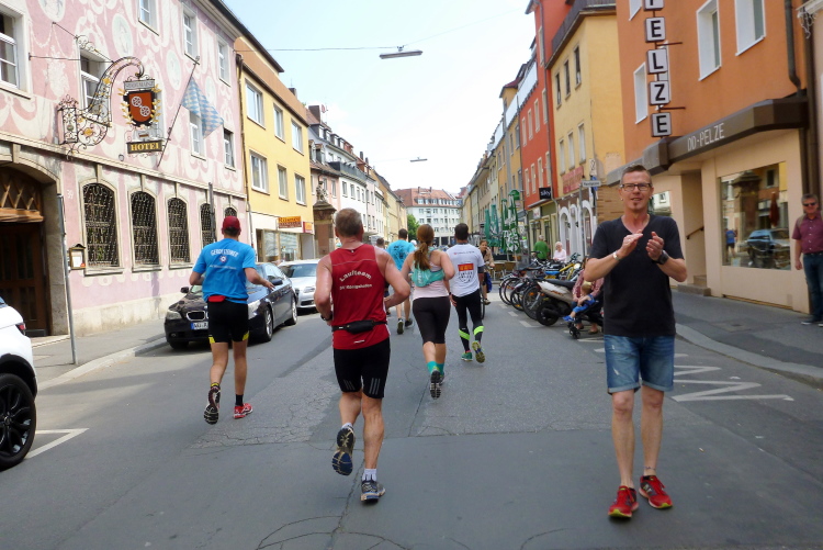 Das Feld hat sich deutlich ausgedünnt, man sollte nicht lange darüber nachdenken, sondern sein Rennen machen. Die meiste Fotoarbeit ist getan, mein Hauptaugenmerk gilt daher mir selbst. Die Wärme hat weiter zugenommen, vielleicht an die 25 Grad. Kühlung ist angesagt. Sascha läuft seinen ersten Marathon, ist gut unterwegs, leider plagt ihn ein Wolf. Tipp: Vaseline! Wir erhöhen ein wenig unser Tempo und können nach weiteren 15 Minuten auf die 4 Stunden-Pacer auflaufen. Leicht ist mir das gefallen. Nur kurz brauche ich Bedenkzeit und laufe dann bei der ersten Wasserstelle in Zellerau der Gruppe davon. Ab jetzt brauche ich Cola und Bier für innen und Wasser für außen. Bei der Begegnungsstrecke grüßen wir uns gegenseitig.