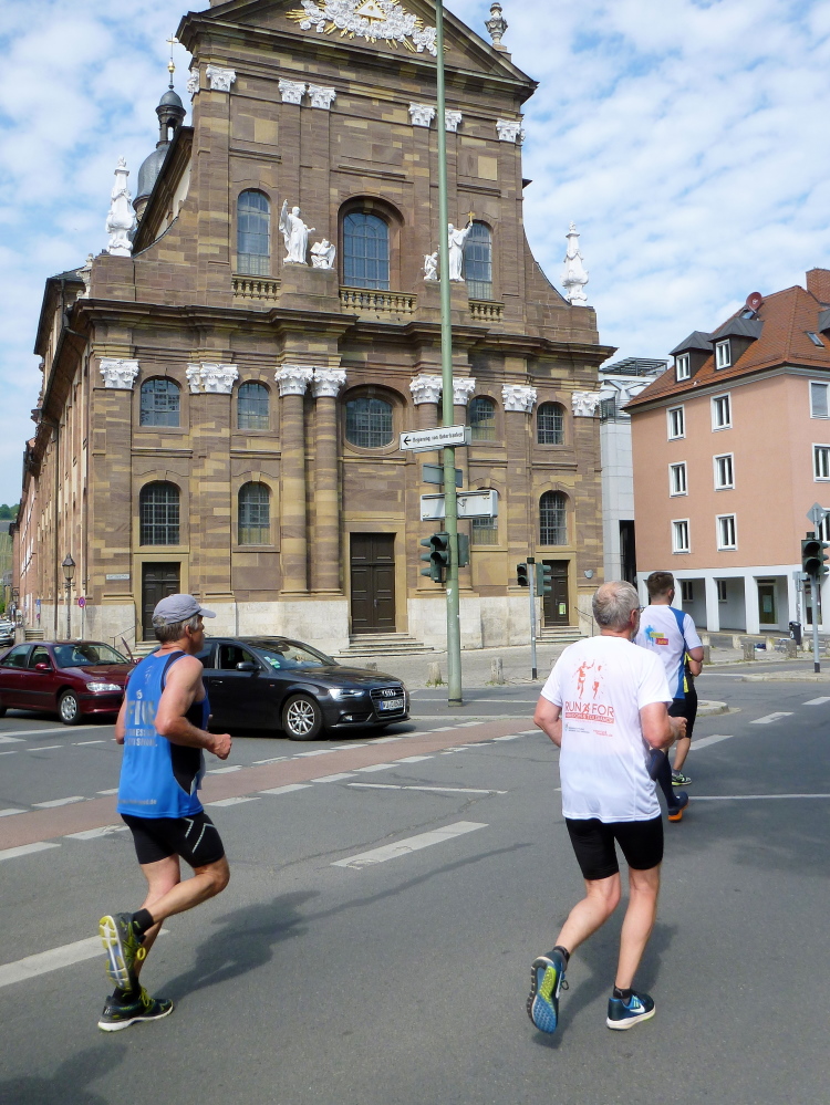 Ein letzter kleiner Ausflug in die Altstadt. Wir laufen auf den Marktplatz mit dem Falkenhaus, der Marienkapelle und dem Fürstlich Castell'schen Bankhaus. In der Karmelitenstraße kommt die Marathonweiche, Halbmarathonis werden rechts, wir links eingewiesen. Vom Zielbereich höre ich Peter Maisenbacher und laute Musik. Wer als Marathoni schon alle Kraft verschossen hat, kann beim Einbiegen auf das Halbmarathonziel trotzdem gewertet werden. Für mich ist das keine Option. Weiter.