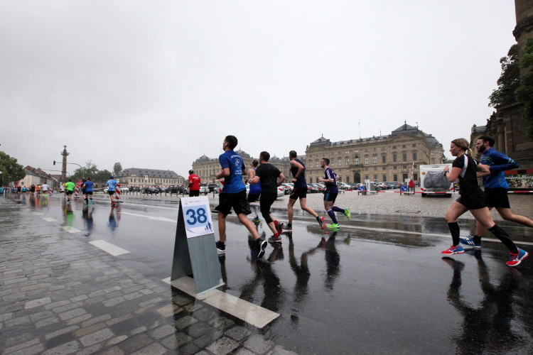 Befürchtet hatten die Veranstalter des iWelt-Marathons Würzburg eher einen Hitzelauf, als sie ihren Lauf erstmals in den Juni legten. Doch im launischen Frühsommer des Jahres 2016 kam es anders. Am 12. Juni wurden die Sportlerinnen und Sportler nicht vom Hitzeschweiß nass, sondern von mehreren, teilweise starken Regenschauern.