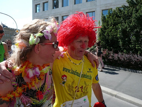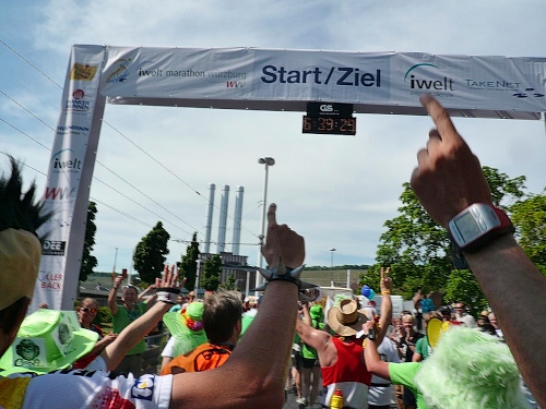 Und dann verlassen wir unweit des Krankenkais die Altstadt und sehen dann das Zieltransparent auf der Höhe des Congress Centrums. Immer noch sind viele Zuschauer vor Ort. Die Stimmung in unserem Laufteam nimmt zu. Wer noch Luft und Puste hat, der lässt seiner Freude freie Bahn. 6.39.30 Stunden lese ich auf der Zieluhr. Netto werden es so 6.30 Stunden sein. Aber das Wichtigste ist, wir sind durch und keiner musste abhängen.