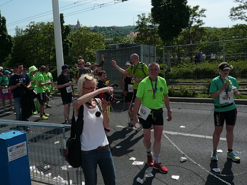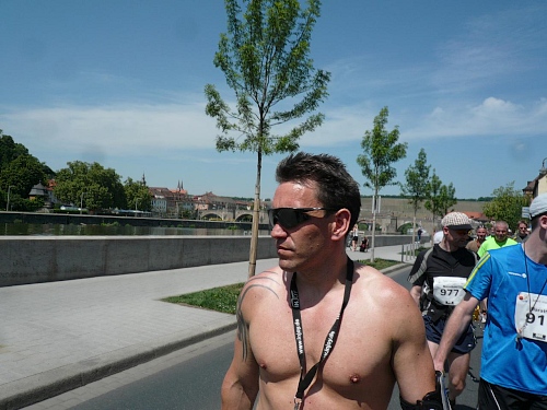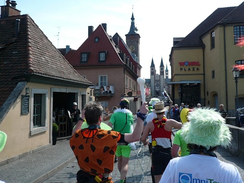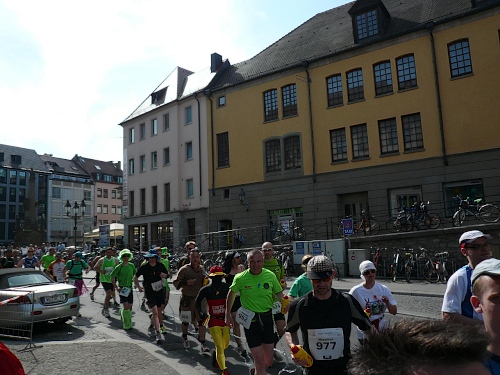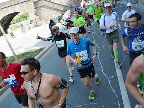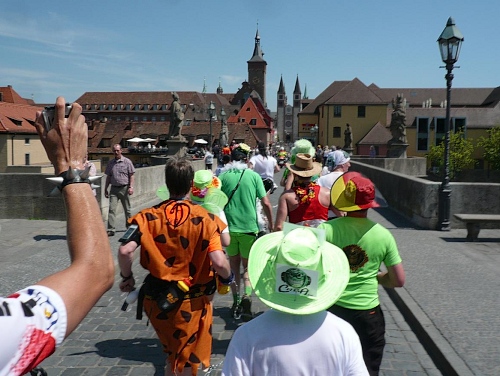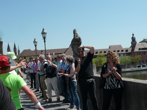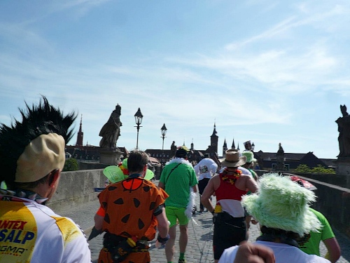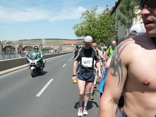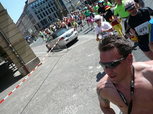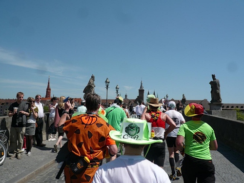 Für die schnellen Läufer mag das grobe Kopfsteinpflaster auf der Brücke ein Graus sein, aber bei unserer Schleichfahrt können wir die Begeisterung der Touristen und Zuschauer voll auskosten. Wenn Ihr in Regensburg über die Steinerne Brücke oder in Prag über die Karlsbrücke gegangen seid, dann werdet Ihr einige Parallelen dieser Bauwerke bemerken. Die Brückenheiligen, die Geschichten der Werke, die leidenden Marathonis, wenn sie drüber laufen etc.