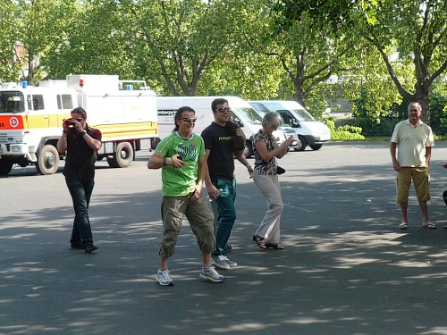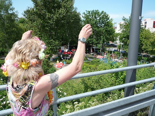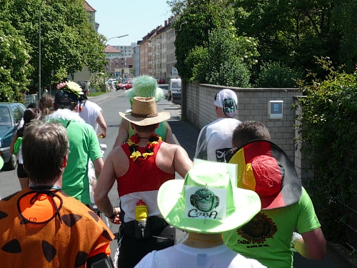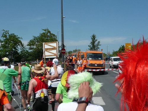 Dann der Höhepunkt. Ein Polizeiauto hält. Ein Polizist (der Einsatzleiter?) steigt aus und verlangt den Chef der Gruppe. Die Verhandlungen dauern fast fünf Minuten, dann dürfen wir weiter. Aber wir müssen innerhalb kürzester Zeit das Streckenstück der B19 erreichen. Sonst wird die Absperrung aufgehoben. Jetzt müssten wir eigentlich Tempo machen. John macht einen Vorschlag: Umdrehen, auf kürzestem Weg in die Innenstadt und noch mal Remmi Demmi machen. Abgelehnt!
