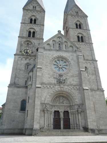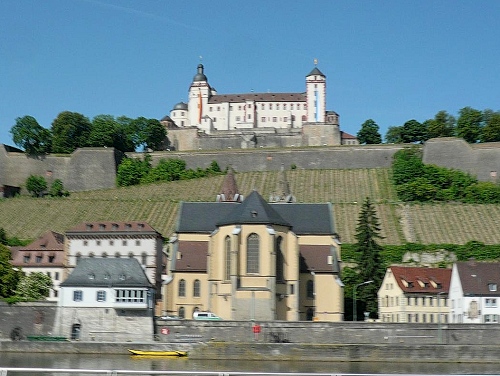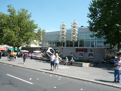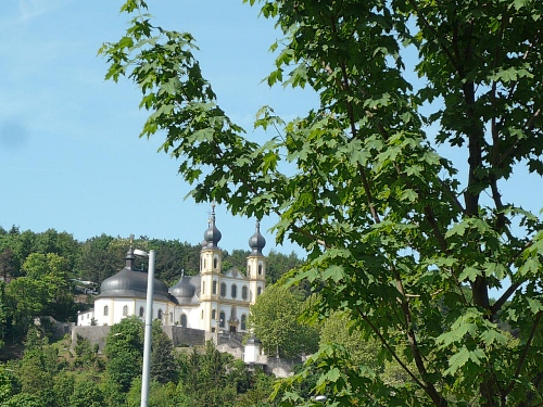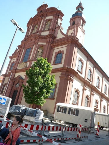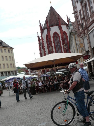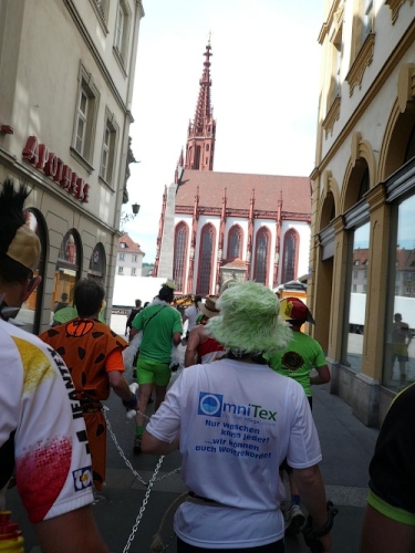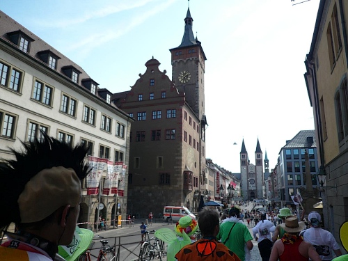 Der Rote Bau, ein Familienpalais und das Bürgerspital sind die nächsten Sehenswürdigkeiten auf unserem Kurs auf der Theaterstraße. Kilometer 18 liegt hinter uns, als wir auf der Juliuspromenade laufen. Rechts das Juliusspital und dann nach der Linkskurve wieder ein Highlight. Auf der Schönbornstraße sehen wir zuerst die Augustinerkirche, das Neumünster und den Dom St. Kilian. Der ist die viertgrößte romanische Kirche in Deutschland, erbaut im 11. und 12. Jahrhundert.