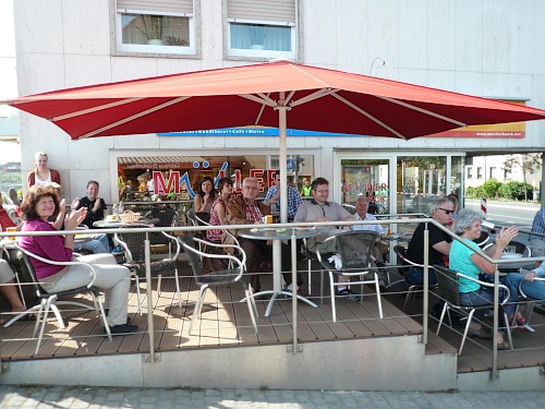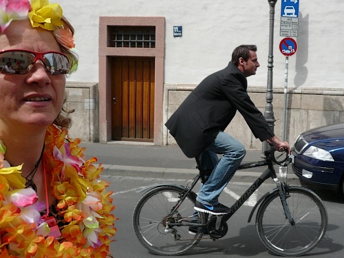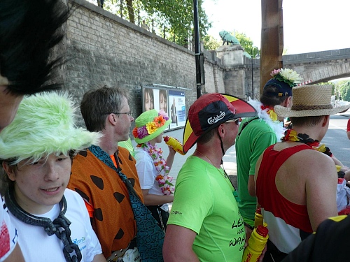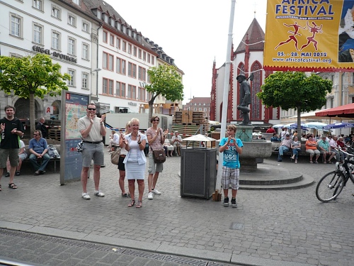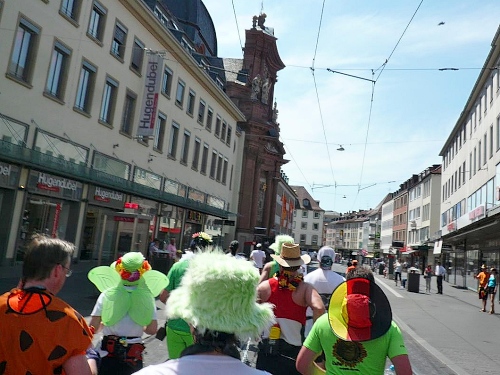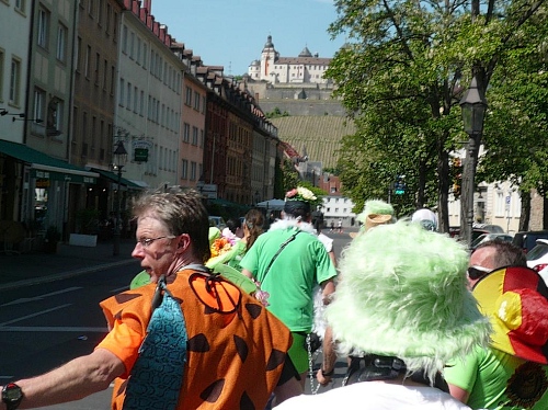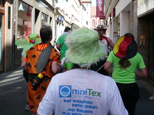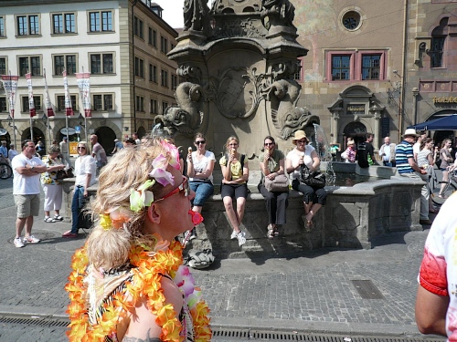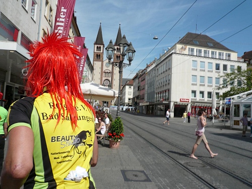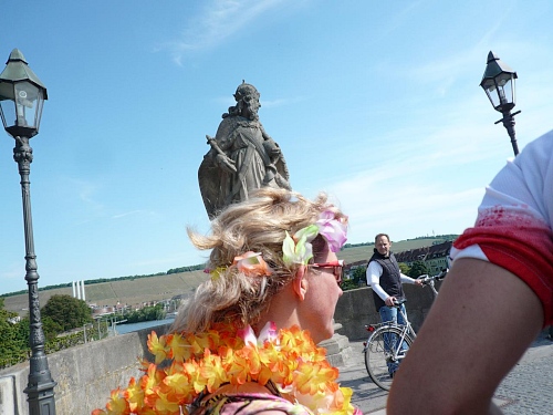 Auf dem Oberen Mainkai der nächste Dämpfer. John entledigt sich seiner überflüssigen Klamotten. Wir verlieren weiter Zeit. Dann kommt doch wieder etwas Spaß auf, weil einer Imodium-Bedarf signalisiert. „Dann ziehen wir eine Scheiß-Spur hinter uns her“, wird gelästert.