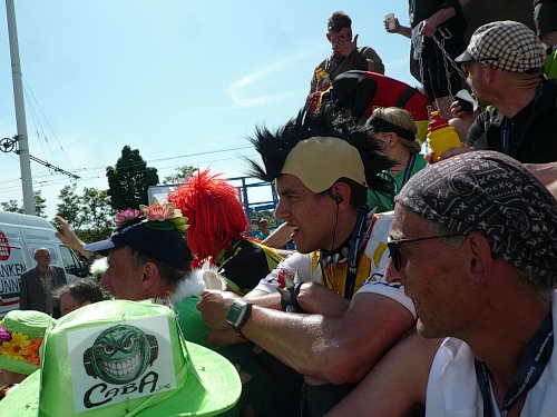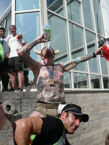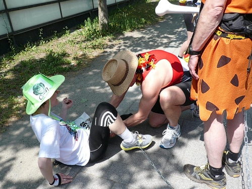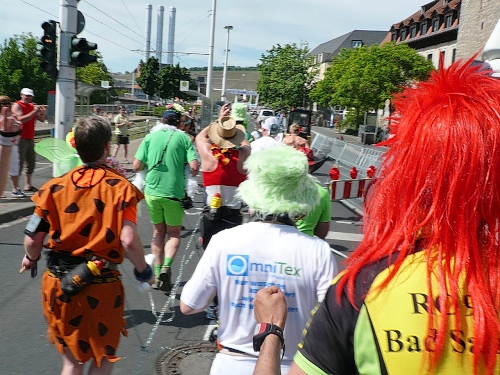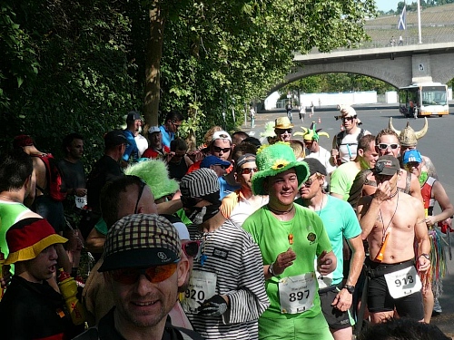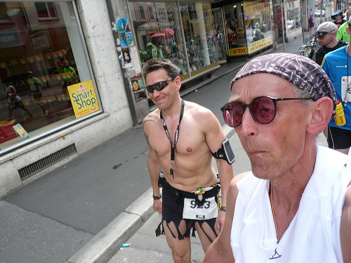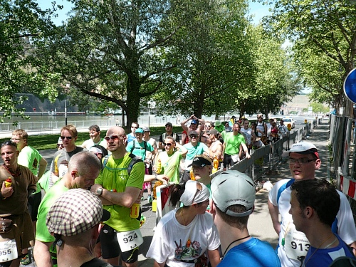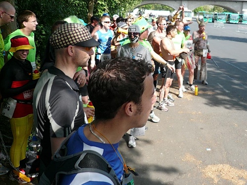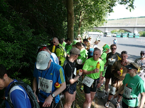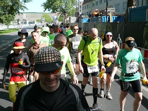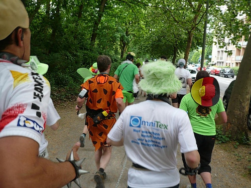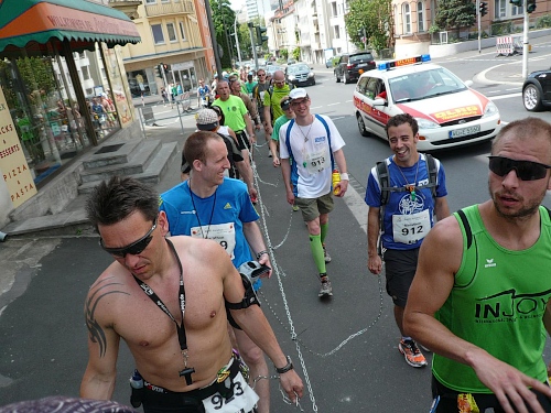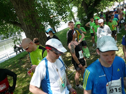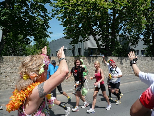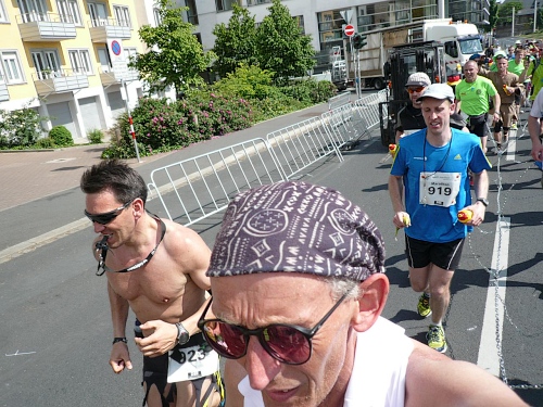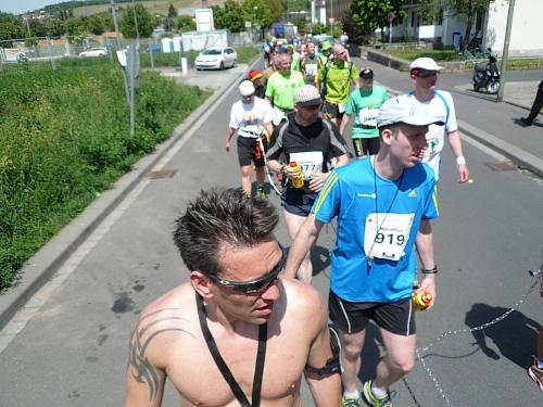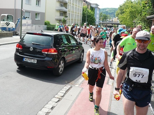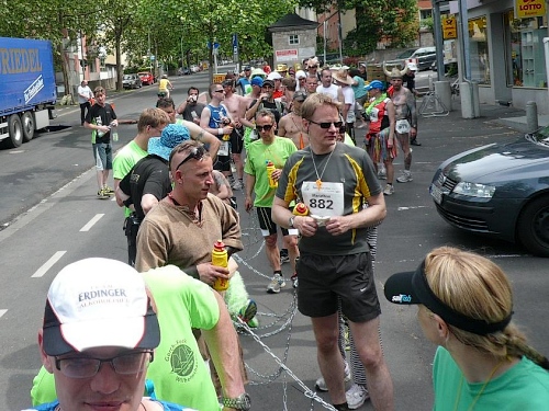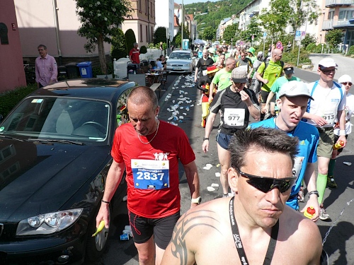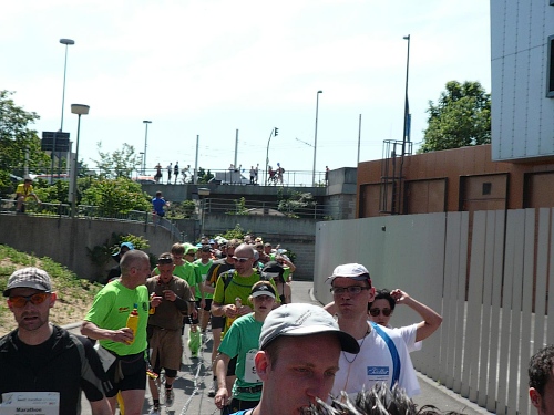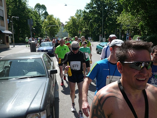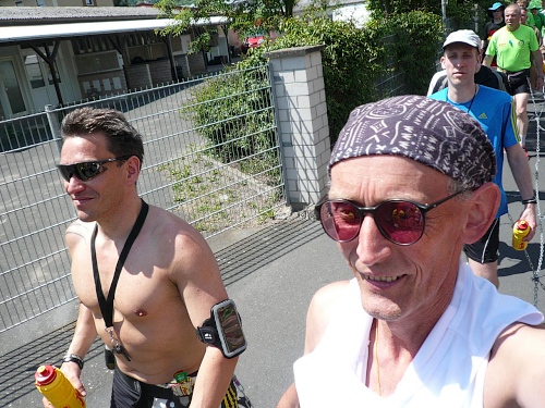 Minuten später müssen Sanitäter helfen. Einer hat Kreislaufprobleme, bekommt jedoch das okay von den Sanis, wenn das Tempo verlangsamt wird. Nur ein kleines Wegstück weiter will sich eine Frau in meiner Nähe abketten. Auch der Kreislauf. Die Nachbarn um sie herum päppeln sie wieder mit Elektrolyten und Gels auf. Sie kann weiter.