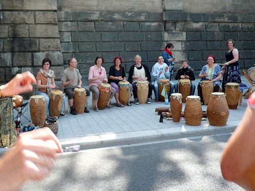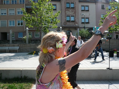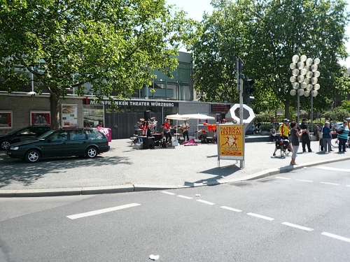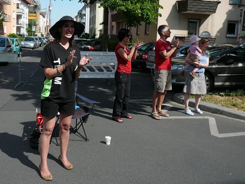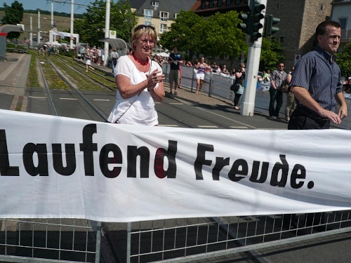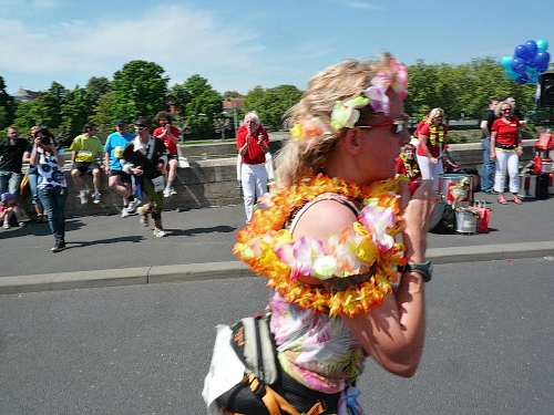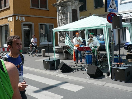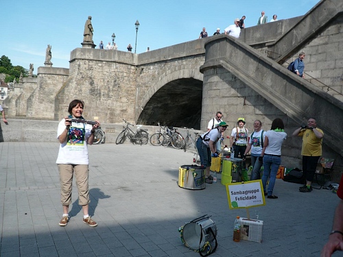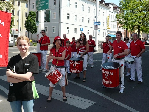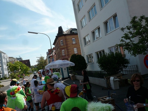 Nach einem Schlenkerer von 270 Grad links herum laufen wir auf dem Oberen Mainkai. Die Sambagruppe Felicidade beendet gerade ihre Kreativitätspause und hilft uns mit ihren Trommeln weiter.