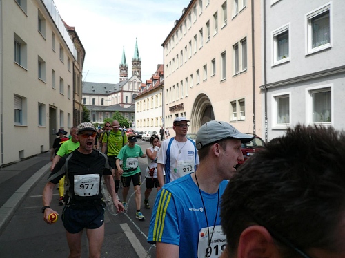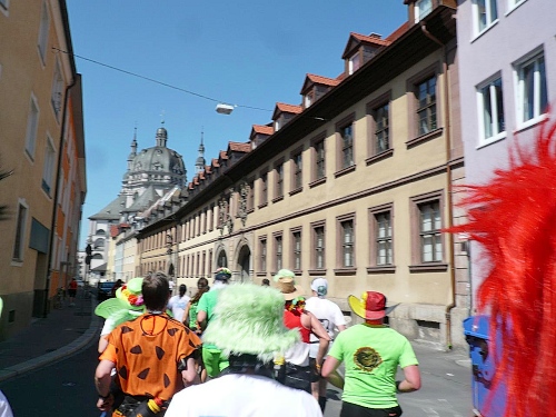 Für drei Kilometer ist der Main unser Begleiter auf der rechten Seite. Nur für einen kleinen Schlenkerer geht es kurz in ein Wohngebiet der Sanderau. Wir biegen dann auf eine Kraftfahrstraße (B19), wo eine Spur für die Läufer gesperrt ist. Auf diesen Teilstücken sind etwa 20 Höhenmeter zu bezwingen. Später überholt uns der Führende im Marathonfeld.