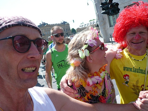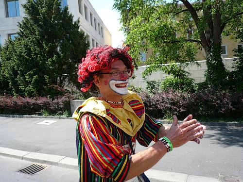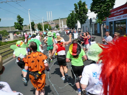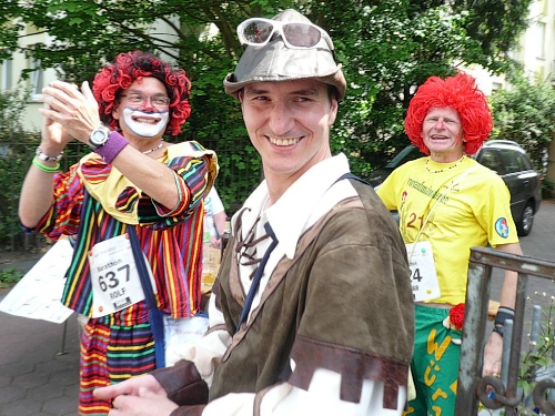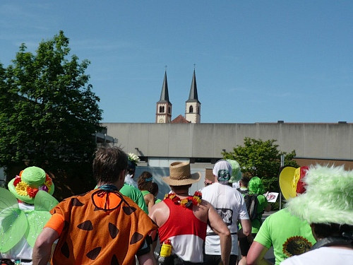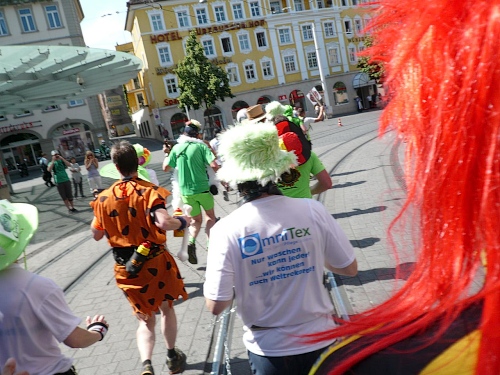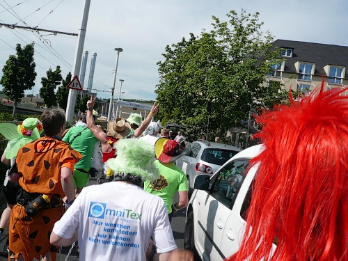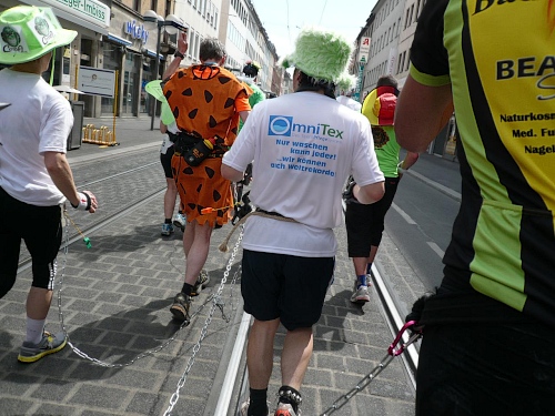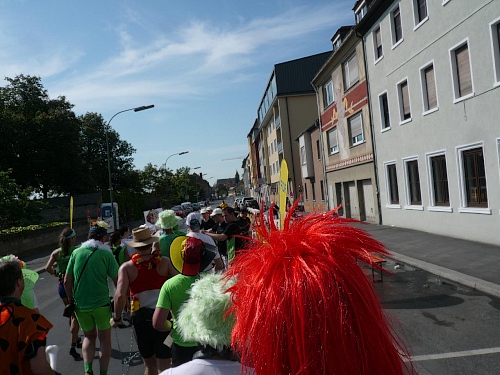 Die Gaudi dauert an in der Gruppe. Gesänge, Lieder, Lärm, die Stimmung ist in der Innenstadt schier am Kochen. Und die Zuschauer lassen sich mit Applaus nicht lumpen. Für viel Begeisterung, nicht nur bei den Kindern, sorgen Pumuckl und seine Mitstreiter, die von hinten kommen. Sie sammeln heute wieder Spenden für den Laufclub 21.