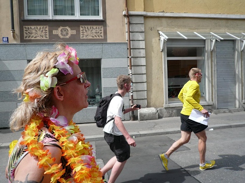 Puuh, zumindest haben wir diese Hürde genommen. Aber jetzt sind die Straßenabsperrungen aufgehoben. Wir müssen auf dem Gehsteig weiterlaufen. Nächstes Problem. Die sind teilweise so schmal, dass man maximal zu zweit nebeneinander gehen kann. Und das ist für die Kette wirklich zu schmal.