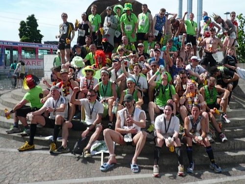 Es wird anstrengender, kaum mehr Schatten, Hitze. Die Pausen an den V-Stellen werden länger. Es wird mehr gegangen als gelaufen. Bei Kilometer 27 sind wir bereits deutlich über der Sollzeit. Ich stelle den Weltrekord infrage. Nicht wegen der Zeit, sondern weil sich die Laufbedingungen verschärft haben. Es sind einige Marathonneulingen im Feld! Der Spaßfaktor auf der ersten Hälfte ist jetzt in den Hintergrund gerückt.