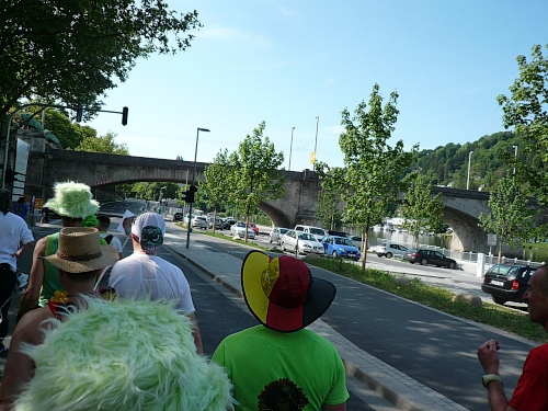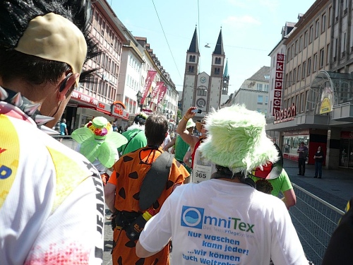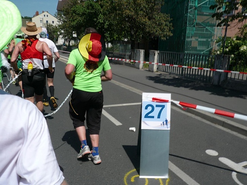 Die Uhr sagt 2.45 Stunden Laufzeit für 21 Kilometer. Sollzeit ist 5.30 Stunden und es ist schon deutlich wärmer geworden. Reicht die Zeit für uns? Unterhalb der Veitshöchheimer Straße benötigt eine Läuferin vor mir eine längere Pause. Sie hat wiederholt Muskelkrämpfe. Ein Läufer verpasst ihr eine muskuläre (Ross-)Kur auf Massagebasis. Ich kann gar nicht hinschauen.