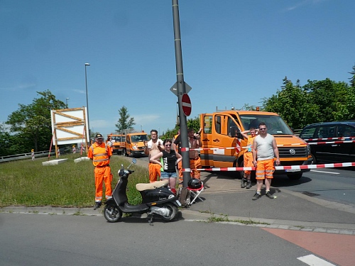 An der B19 (Kilometer 32,5) werden wir bereits von einem Arbeiter des Bauhofes erwartet. Er begleitet uns bis zur Ableitung von der Kraftfahrstraße. Sorry, liebe Freunde des Bauhofes, wenn wir Euch so lange haben warten lassen.